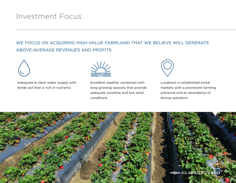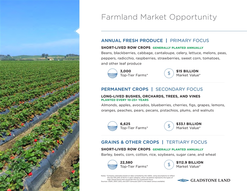 Farmland Market Opportunity ANNUAL FRESH PRODUCE | PRIMARY FOCUS SHORT-LIVED ROW CROPS GENERALLY PLANTED ANNUALLY Beans, blackberries, cabbage, cantaloupe, celery, lettuce, melons, peas, peppers, radicchio, raspberries, strawberries, sweet corn, tomatoes, and other leaf pr oduce 3,000 $15 BILLION $ Top-Tier Farms* Market Value* PERMANENT CROPS | SECONDARY FOCUS LONG-LIVED BUSHES, ORCHARDS, TREES, AND VINES PLANTED EVERY 10-25+ YEARS Almonds, apples, avocados, blueberries, cherries, figs, grapes, lemons, oranges, peaches, pears, pecans, pistachios, plums, and walnuts 6,625 $33.1 BILLION $ Top-Tier Farms* Market Value* GRAINS & OTHER CROPS | TERTIARY FOCUS SHORT-LIVED ROW CROPS GENERALLY PLANTED ANNUALLY Barley, beets, corn, cotton, rice, soybeans, sugar cane, and wheat 22,580 $112.9 BILLION $ Top-Tier Farms* Market Value* Notes: *Company estimates based on data compiled by the USDA, using assumptions to reflect the top 10%-25% of farms in each category, which we believe represents the types of high-valued farms that would fall into our investment focus Sources: USDA, 2007, 2012, and 2017 Censuses (2017 is the latest census available) 10Farmland Market Opportunity ANNUAL FRESH PRODUCE | PRIMARY FOCUS SHORT-LIVED ROW CROPS GENERALLY PLANTED ANNUALLY Beans, blackberries, cabbage, cantaloupe, celery, lettuce, melons, peas, peppers, radicchio, raspberries, strawberries, sweet corn, tomatoes, and other leaf pr oduce 3,000 $15 BILLION $ Top-Tier Farms* Market Value* PERMANENT CROPS | SECONDARY FOCUS LONG-LIVED BUSHES, ORCHARDS, TREES, AND VINES PLANTED EVERY 10-25+ YEARS Almonds, apples, avocados, blueberries, cherries, figs, grapes, lemons, oranges, peaches, pears, pecans, pistachios, plums, and walnuts 6,625 $33.1 BILLION $ Top-Tier Farms* Market Value* GRAINS & OTHER CROPS | TERTIARY FOCUS SHORT-LIVED ROW CROPS GENERALLY PLANTED ANNUALLY Barley, beets, corn, cotton, rice, soybeans, sugar cane, and wheat 22,580 $112.9 BILLION $ Top-Tier Farms* Market Value* Notes: *Company estimates based on data compiled by the USDA, using assumptions to reflect the top 10%-25% of farms in each category, which we believe represents the types of high-valued farms that would fall into our investment focus Sources: USDA, 2007, 2012, and 2017 Censuses (2017 is the latest census available) 10