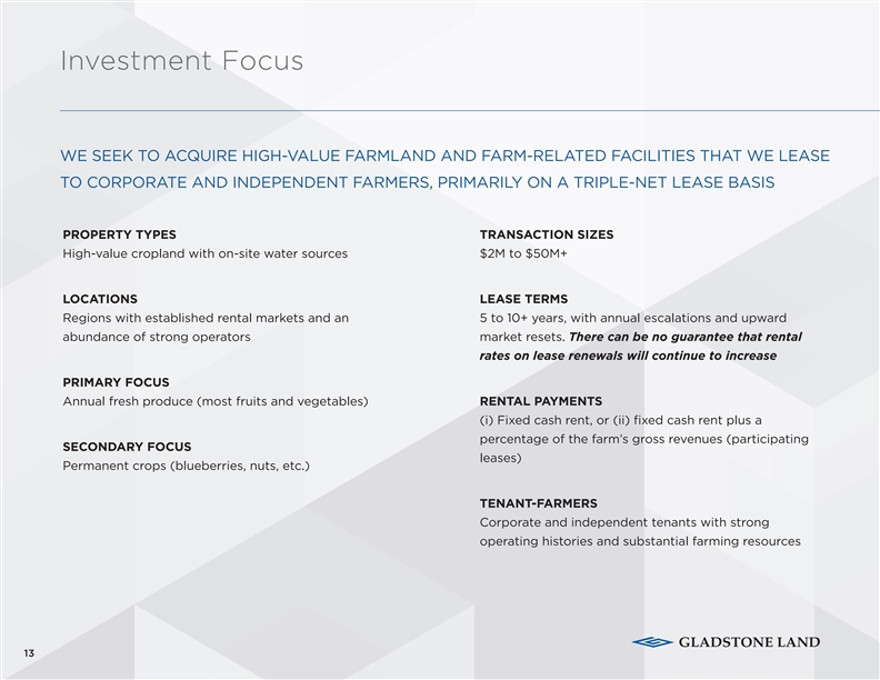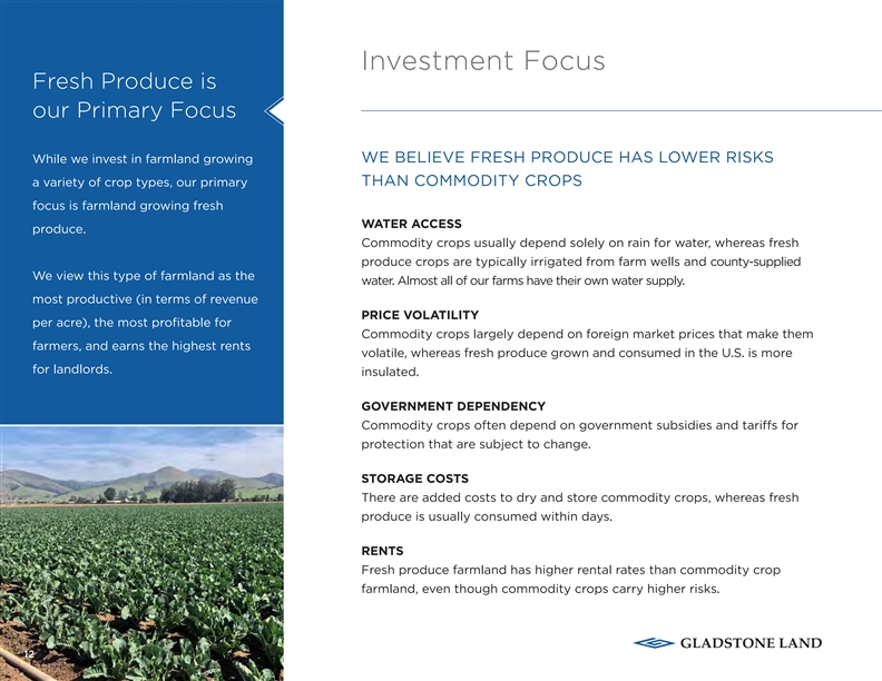 Investment Focus Fresh Produce is our Primary Focus WE BELIEVE FRESH PRODUCE HAS LOWER RISKS While we invest in farmland growing THAN COMMODITY CROPS a variety of crop types, our primary focus is farmland growing fresh WATER ACCESS produce . Commodity crops usually depend solely on rain for water, whereas fresh produce crops are typically irrigated from farm wells and county-supplied We view this type of farmland as the water. Almost all of our farms have their own water supply. most productive (in terms of revenue PRICE VOLATILITY per acre), the most profitable for Commodity crops largely depend on foreign market prices that make them farmers, and earns the highest rents volatile, whereas fresh produce grown and consumed in the U.S. is more for landlords. insulated. GOVERNMENT DEPENDENCY Commodity crops often depend on government subsidies and taris for protection that are subject to change. STORAGE COSTS There are added costs to dry and store commodity crops, whereas fresh produce is usually consumed within days. RENTS Fresh produce farmland has higher rental rates than commodity crop farmland, even though commodity crops carry higher risks. 12Investment Focus Fresh Produce is our Primary Focus WE BELIEVE FRESH PRODUCE HAS LOWER RISKS While we invest in farmland growing THAN COMMODITY CROPS a variety of crop types, our primary focus is farmland growing fresh WATER ACCESS produce . Commodity crops usually depend solely on rain for water, whereas fresh produce crops are typically irrigated from farm wells and county-supplied We view this type of farmland as the water. Almost all of our farms have their own water supply. most productive (in terms of revenue PRICE VOLATILITY per acre), the most profitable for Commodity crops largely depend on foreign market prices that make them farmers, and earns the highest rents volatile, whereas fresh produce grown and consumed in the U.S. is more for landlords. insulated. GOVERNMENT DEPENDENCY Commodity crops often depend on government subsidies and taris for protection that are subject to change. STORAGE COSTS There are added costs to dry and store commodity crops, whereas fresh produce is usually consumed within days. RENTS Fresh produce farmland has higher rental rates than commodity crop farmland, even though commodity crops carry higher risks. 12