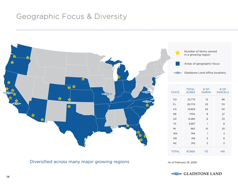 Investment Focus WE SEEK TO ACQUIRE HIGH-VALUE FARMLAND AND FARM-RELATED FACILITIES THAT WE LEASE TO CORPORATE AND INDEPENDENT FARMERS, PRIMARILY ON A TRIPLE-NET LEASE BASIS PROPERTY TYPES TRANSACTION SIZES High-value cropland with on-site water sources $2M to $50M+ LOCATIONS LEASE TERMS Regions with established rental markets and an 5 to 10+ years, with annual escalations and upward abundance of strong operators market resets . There can be no guarantee that rental rates on lease renewals will continue to increase PRIMARY FOCUS Annual fresh produce (most fruits and vegetables) RENTAL PAYMENTS (i) Fixed cash rent, or (ii) fixed cash rent plus a percentage of the farm’s gross revenues (participating SECONDARY FOCUS leases) Permanent crops (blueberries, nuts, etc.) TENANT-FARMERS Corporate and independent tenants with strong operating histories and substantial farming resources 13Investment Focus WE SEEK TO ACQUIRE HIGH-VALUE FARMLAND AND FARM-RELATED FACILITIES THAT WE LEASE TO CORPORATE AND INDEPENDENT FARMERS, PRIMARILY ON A TRIPLE-NET LEASE BASIS PROPERTY TYPES TRANSACTION SIZES High-value cropland with on-site water sources $2M to $50M+ LOCATIONS LEASE TERMS Regions with established rental markets and an 5 to 10+ years, with annual escalations and upward abundance of strong operators market resets . There can be no guarantee that rental rates on lease renewals will continue to increase PRIMARY FOCUS Annual fresh produce (most fruits and vegetables) RENTAL PAYMENTS (i) Fixed cash rent, or (ii) fixed cash rent plus a percentage of the farm’s gross revenues (participating SECONDARY FOCUS leases) Permanent crops (blueberries, nuts, etc.) TENANT-FARMERS Corporate and independent tenants with strong operating histories and substantial farming resources 13