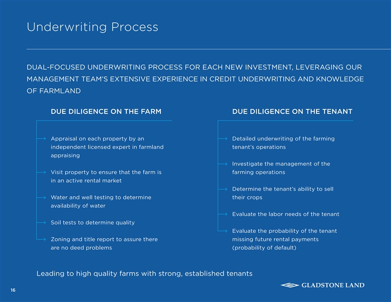 Underwriting Process DUAL-FOCUSED UNDERWRITING PROCESS FOR EACH NEW INVESTMENT, LEVERAGING OUR MANAGEMENT TEAM’S EXTENSIVE EXPERIENCE IN CREDIT UNDERWRITING AND KNOWLEDGE OF FARMLAND DUE DILIGENCE ON THE FARM DUE DILIGENCE ON THE TENANT Appraisal on each property by an Detailed underwriting of the farming independent licensed expert in farmland tenant’s operations appraising Investigate the management of the Visit property to ensure that the farm is farming operations in an active rental market Determine the tenant’s ability to sell Water and well testing to determine their crops availability of water Evaluate the labor needs of the tenant Soil tests to determine quality Evaluate the probability of the tenant Zoning and title report to assure there missing future rental payments are no deed problems (probability of default) Leading to high quality farms with strong, established tenants 16Underwriting Process DUAL-FOCUSED UNDERWRITING PROCESS FOR EACH NEW INVESTMENT, LEVERAGING OUR MANAGEMENT TEAM’S EXTENSIVE EXPERIENCE IN CREDIT UNDERWRITING AND KNOWLEDGE OF FARMLAND DUE DILIGENCE ON THE FARM DUE DILIGENCE ON THE TENANT Appraisal on each property by an Detailed underwriting of the farming independent licensed expert in farmland tenant’s operations appraising Investigate the management of the Visit property to ensure that the farm is farming operations in an active rental market Determine the tenant’s ability to sell Water and well testing to determine their crops availability of water Evaluate the labor needs of the tenant Soil tests to determine quality Evaluate the probability of the tenant Zoning and title report to assure there missing future rental payments are no deed problems (probability of default) Leading to high quality farms with strong, established tenants 16