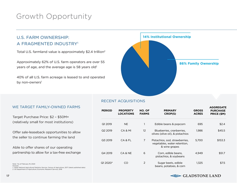 Growth Opportunity 14% Institutional Ownership U.S. FARM OWNERSHIP: 1 A FRAGMENTED INDUSTRY 2 Total U.S. farmland value is approximately $2.4 trillion Approximately 62% of U.S. farm operators are over 55 86% Family Ownership 1 years of age, and the average age is 58 years old 40% of all U.S. farm acreage is leased to and operated 1 by non-owners RECENT ACQUISITIONS WE TARGET FAMILY-OWNED FARMS AGGREGATE PERIOD PROPERTY NO. OF PRIMARY GROSS PURCHASE LOCATIONS FARMS CROP(S) ACRES PRICE ($M) Target Purchase Price: $2 – $50M+ (relatively small for most institutions) Q1 2019 NE 1 Edible beans & popcorn 695 $2.4 Q2 2019 CA & MI 12 Blueberries, cranberries, 1,986 $45.5 Oer sale-leaseback opportunities to allow olives (olive oil), & pistachios the seller to continue farming the land Q3 2019 CA & FL 7 Pistachios, sod, strawberries, 5,700 $153.3 vegetables, water retention, & wine grapes Able to oer shares of our operating partnership to allow for a tax-free exchange Q4 2019 CA & NE 6 Corn, edible beans, 4,949 $51.7 pistachios, & soybeans 2 Q1 2020* CO Sugar beets, edible 1,325 $7.5 Note: *As of February 19, 2020 Sources: beans, potatoes, & corn 1. USDA National Agricultural Statistics Service, Census of Agriculture, 2017 (latest published data) 2. US Department of Agriculture; Economic Research Service; 2018 17Growth Opportunity 14% Institutional Ownership U.S. FARM OWNERSHIP: 1 A FRAGMENTED INDUSTRY 2 Total U.S. farmland value is approximately $2.4 trillion Approximately 62% of U.S. farm operators are over 55 86% Family Ownership 1 years of age, and the average age is 58 years old 40% of all U.S. farm acreage is leased to and operated 1 by non-owners RECENT ACQUISITIONS WE TARGET FAMILY-OWNED FARMS AGGREGATE PERIOD PROPERTY NO. OF PRIMARY GROSS PURCHASE LOCATIONS FARMS CROP(S) ACRES PRICE ($M) Target Purchase Price: $2 – $50M+ (relatively small for most institutions) Q1 2019 NE 1 Edible beans & popcorn 695 $2.4 Q2 2019 CA & MI 12 Blueberries, cranberries, 1,986 $45.5 Oer sale-leaseback opportunities to allow olives (olive oil), & pistachios the seller to continue farming the land Q3 2019 CA & FL 7 Pistachios, sod, strawberries, 5,700 $153.3 vegetables, water retention, & wine grapes Able to oer shares of our operating partnership to allow for a tax-free exchange Q4 2019 CA & NE 6 Corn, edible beans, 4,949 $51.7 pistachios, & soybeans 2 Q1 2020* CO Sugar beets, edible 1,325 $7.5 Note: *As of February 19, 2020 Sources: beans, potatoes, & corn 1. USDA National Agricultural Statistics Service, Census of Agriculture, 2017 (latest published data) 2. US Department of Agriculture; Economic Research Service; 2018 17