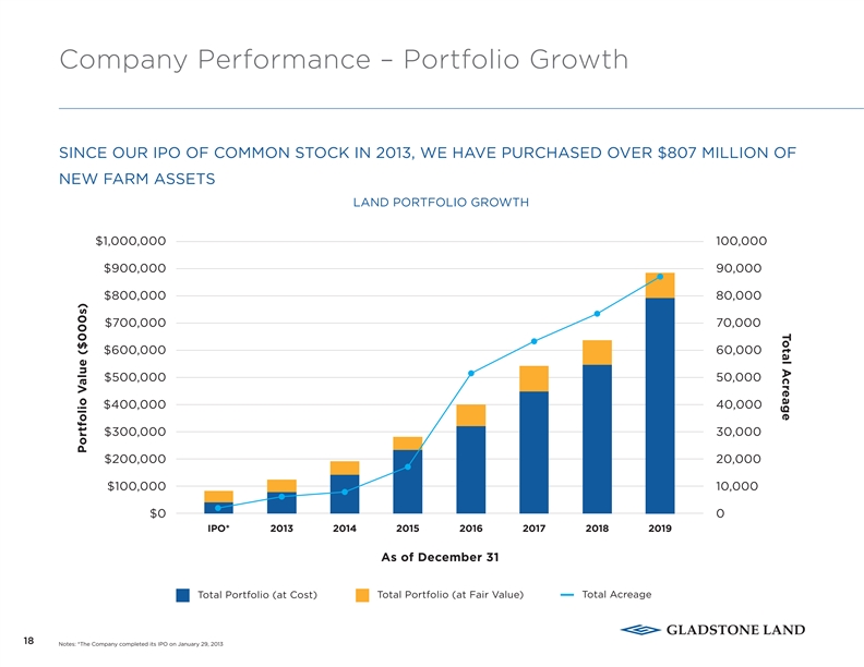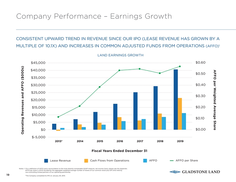 Total Acreage Company Performance – Portfolio Growth SINCE OUR IPO OF COMMON STOCK IN 2013, WE HAVE PURCHASED OVER $807 MILLION OF NEW FARM ASSETS LAND PORTFOLIO GROWTH $1,000,000 100,000 $900,000 90,000 $800,000 80,000 $700,000 70,000 $600,000 60,000 $500,000 50,000 $400,000 40,000 $300,000 30,000 $200,000 20,000 $100,000 10,000 $0 0 IPO* 2013 2014 2015 2016 2017 2018 2019 As of December 31 Total Acreage Total Portfolio (at Cost) Total Portfolio (at Fair Value) 18 Notes: *The Company completed its IPO on January 29, 2013 Portfolio Value ($000s)Total Acreage Company Performance – Portfolio Growth SINCE OUR IPO OF COMMON STOCK IN 2013, WE HAVE PURCHASED OVER $807 MILLION OF NEW FARM ASSETS LAND PORTFOLIO GROWTH $1,000,000 100,000 $900,000 90,000 $800,000 80,000 $700,000 70,000 $600,000 60,000 $500,000 50,000 $400,000 40,000 $300,000 30,000 $200,000 20,000 $100,000 10,000 $0 0 IPO* 2013 2014 2015 2016 2017 2018 2019 As of December 31 Total Acreage Total Portfolio (at Cost) Total Portfolio (at Fair Value) 18 Notes: *The Company completed its IPO on January 29, 2013 Portfolio Value ($000s)