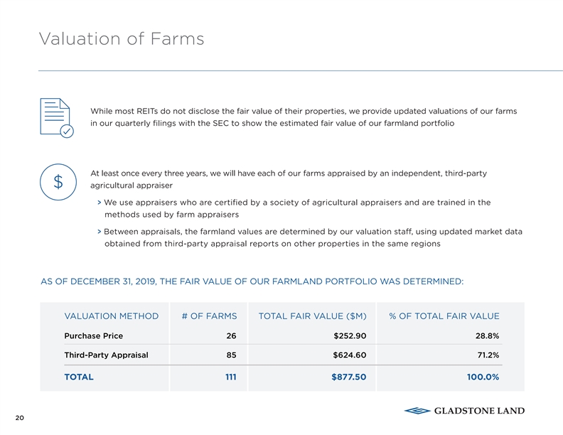 Valuation of Farms While most REITs do not disclose the fair value of their properties, we provide updated valuations of our farms in our quarterly filings with the SEC to show the estimated fair value of our farmland portfolio At least once every three years, we will have each of our farms appraised by an independent, third-party $ agricultural appraiser > We use appraisers who are certified by a society of agricultural appraisers and are trained in the methods used by farm appraisers > Between appraisals, the farmland values are determined by our valuation sta, using updated market data obtained from third-party appraisal reports on other properties in the same regions AS OF DECEMBER 31, 2019, THE FAIR VALUE OF OUR FARMLAND PORTFOLIO WAS DETERMINED: VALUATION METHOD # OF FARMS TOTAL FAIR VALUE ($M) % OF TOTAL FAIR VALUE Purchase Price 26 $252.90 28.8% Third-Party Appraisal 85 $624.60 71.2% TOTAL 111 $877.50 100.0% 20Valuation of Farms While most REITs do not disclose the fair value of their properties, we provide updated valuations of our farms in our quarterly filings with the SEC to show the estimated fair value of our farmland portfolio At least once every three years, we will have each of our farms appraised by an independent, third-party $ agricultural appraiser > We use appraisers who are certified by a society of agricultural appraisers and are trained in the methods used by farm appraisers > Between appraisals, the farmland values are determined by our valuation sta, using updated market data obtained from third-party appraisal reports on other properties in the same regions AS OF DECEMBER 31, 2019, THE FAIR VALUE OF OUR FARMLAND PORTFOLIO WAS DETERMINED: VALUATION METHOD # OF FARMS TOTAL FAIR VALUE ($M) % OF TOTAL FAIR VALUE Purchase Price 26 $252.90 28.8% Third-Party Appraisal 85 $624.60 71.2% TOTAL 111 $877.50 100.0% 20