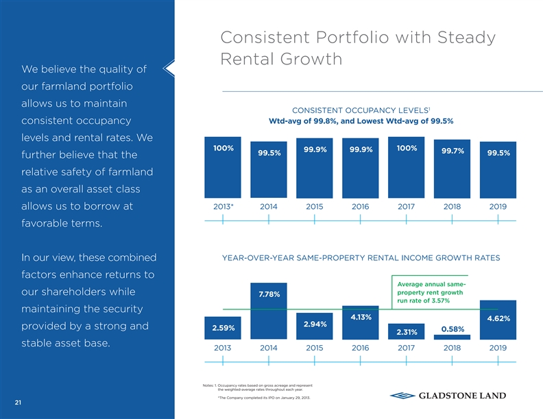 Consistent Portfolio with Steady Rental Growth We believe the quality of our farmland portfolio allows us to maintain 1 CONSISTENT OCCUPANCY LEVELS consistent occupancy Wtd-avg of 99.8%, and Lowest Wtd-avg of 99.5% levels and rental rates. We 100% 100% 99.9% 99.9% 99.7% 99.5% 99.5% further believe that the relative safety of farmland as an overall asset class allows us to borrow at 2013* 2014 2015 2016 2017 2018 2019 favorable terms. In our view, these combined YEAR-OVER-YEAR SAME-PROPERTY RENTAL INCOME GROWTH RATES factors enhance returns to Average annual same- property rent growth our shareholders while 7.78% run rate of 3.57% maintaining the security 4.13% 4.62% 2.94% provided by a strong and 2.59% 0.58% 2.31% stable asset base. 2013 2014 2015 2016 2017 2018 2019 Notes: 1. Occupancy rates based on gross acreage and represent the weighted-average rates throughout each year. *The Company completed its IPO on January 29, 2013. 21Consistent Portfolio with Steady Rental Growth We believe the quality of our farmland portfolio allows us to maintain 1 CONSISTENT OCCUPANCY LEVELS consistent occupancy Wtd-avg of 99.8%, and Lowest Wtd-avg of 99.5% levels and rental rates. We 100% 100% 99.9% 99.9% 99.7% 99.5% 99.5% further believe that the relative safety of farmland as an overall asset class allows us to borrow at 2013* 2014 2015 2016 2017 2018 2019 favorable terms. In our view, these combined YEAR-OVER-YEAR SAME-PROPERTY RENTAL INCOME GROWTH RATES factors enhance returns to Average annual same- property rent growth our shareholders while 7.78% run rate of 3.57% maintaining the security 4.13% 4.62% 2.94% provided by a strong and 2.59% 0.58% 2.31% stable asset base. 2013 2014 2015 2016 2017 2018 2019 Notes: 1. Occupancy rates based on gross acreage and represent the weighted-average rates throughout each year. *The Company completed its IPO on January 29, 2013. 21