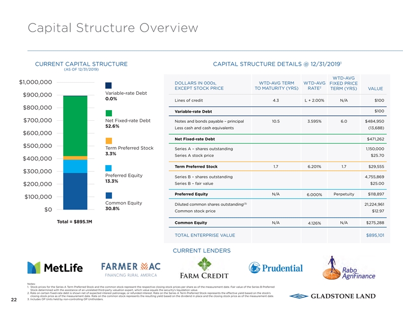 Capital Structure Overview 1 CURRENT CAPITAL STRUCTURE CAPITAL STRUCTURE DETAILS @ 12/31/2019 (AS OF 12/31/2019) WTD-AVG $1,000,000 DOLLARS IN 000s, WTD-AVG TERM WTD-AVG FIXED PRICE 2 EXCEPT STOCK PRICE TO MATURITY (YRS) RATE TERM (YRS) VALUE Variable-rate Debt $900,000 0.0% Lines of credit 4.3 L + 2.00% N/A $100 $800,000 $100 Variable-rate Debt $700,000 Net Fixed-rate Debt Notes and bonds payable – principal 10.5 3.595% 6.0 $484,950 52.6% Less cash and cash equivalents (13,688) $600,000 Net Fixed-rate Debt $471,262 $500,000 Term Preferred Stock Series A – shares outstanding 1,150,000 3.3% Series A stock price $25.70 $400,000 Term Preferred Stock 1.7 6.201% 1.7 $29,555 $300,000 Preferred Equity Series B – shares outstanding 4,755,869 13.3% Series B – fair value $25.00 $200,000 Preferred Equity N/A Perpetuity $118,897 6.000% $100,000 Common Equity (3) Diluted common shares outstanding 21,224,961 30.8% $0 Common stock price $12.97 Total = $895.1M Common Equity N/A N/A $275,288 4.126% TOTAL ENTERPRISE VALUE $895,101 CURRENT LENDERS Notes: 1. Stock prices for the Series A Term Preferred Stock and the common stock represent the respective closing stock prices per share as of the measurement date. Fair value of the Series B Preferred Stock determined with the assistance of an unrelated third-party valuation expert, which value equals the security’s liquidation value. 2. Rate on certain fixed-rate debt is shown net of expected interest patronage, or refunded interest. Rate on the Series A Term Preferred Stock represents the eective yield based on the stock’s closing stock price as of the measurement date. Rate on the common stock represents the resulting yield based on the dividend in place and the closing stock price as of the measurement date. 3. Includes OP Units held by non-controlling OP Unitholders. 22Capital Structure Overview 1 CURRENT CAPITAL STRUCTURE CAPITAL STRUCTURE DETAILS @ 12/31/2019 (AS OF 12/31/2019) WTD-AVG $1,000,000 DOLLARS IN 000s, WTD-AVG TERM WTD-AVG FIXED PRICE 2 EXCEPT STOCK PRICE TO MATURITY (YRS) RATE TERM (YRS) VALUE Variable-rate Debt $900,000 0.0% Lines of credit 4.3 L + 2.00% N/A $100 $800,000 $100 Variable-rate Debt $700,000 Net Fixed-rate Debt Notes and bonds payable – principal 10.5 3.595% 6.0 $484,950 52.6% Less cash and cash equivalents (13,688) $600,000 Net Fixed-rate Debt $471,262 $500,000 Term Preferred Stock Series A – shares outstanding 1,150,000 3.3% Series A stock price $25.70 $400,000 Term Preferred Stock 1.7 6.201% 1.7 $29,555 $300,000 Preferred Equity Series B – shares outstanding 4,755,869 13.3% Series B – fair value $25.00 $200,000 Preferred Equity N/A Perpetuity $118,897 6.000% $100,000 Common Equity (3) Diluted common shares outstanding 21,224,961 30.8% $0 Common stock price $12.97 Total = $895.1M Common Equity N/A N/A $275,288 4.126% TOTAL ENTERPRISE VALUE $895,101 CURRENT LENDERS Notes: 1. Stock prices for the Series A Term Preferred Stock and the common stock represent the respective closing stock prices per share as of the measurement date. Fair value of the Series B Preferred Stock determined with the assistance of an unrelated third-party valuation expert, which value equals the security’s liquidation value. 2. Rate on certain fixed-rate debt is shown net of expected interest patronage, or refunded interest. Rate on the Series A Term Preferred Stock represents the eective yield based on the stock’s closing stock price as of the measurement date. Rate on the common stock represents the resulting yield based on the dividend in place and the closing stock price as of the measurement date. 3. Includes OP Units held by non-controlling OP Unitholders. 22