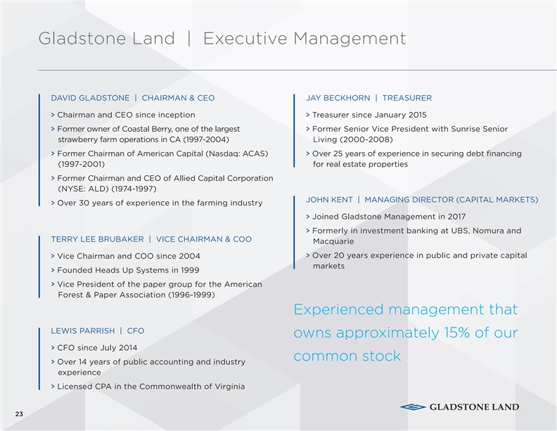 Gladstone Land | Executive Management DAVID GLADSTONE | CHAIRMAN & CEO JAY BECKHORN | TREASURER > Chairman and CEO since inception > Treasurer since January 2015 > Former owner of Coastal Berry, one of the largest > Former Senior Vice President with Sunrise Senior strawberry farm operations in CA (1997-2004) Living (2000-2008) > Former Chairman of American Capital (Nasdaq: ACAS) > Over 25 years of experience in securing debt financing (1997-2001) for real estate properties > Former Chairman and CEO of Allied Capital Corporation (NYSE: ALD) (1974-1997) JOHN KENT | MANAGING DIRECTOR (CAPITAL MARKETS) > Over 30 years of experience in the farming industry > Joined Gladstone Management in 2017 > Formerly in investment banking at UBS, Nomura and TERRY LEE BRUBAKER | VICE CHAIRMAN & COO Macquarie > Over 20 years experience in public and private capital > Vice Chairman and COO since 2004 markets > Founded Heads Up Systems in 1999 > Vice President of the paper group for the American Forest & Paper Association (1996-1999) Experienced management that LEWIS PARRISH | CFO owns approximately 15% of our > CFO since July 2014 common stock > Over 14 years of public accounting and industry experience > Licensed CPA in the Commonwealth of Virginia 23Gladstone Land | Executive Management DAVID GLADSTONE | CHAIRMAN & CEO JAY BECKHORN | TREASURER > Chairman and CEO since inception > Treasurer since January 2015 > Former owner of Coastal Berry, one of the largest > Former Senior Vice President with Sunrise Senior strawberry farm operations in CA (1997-2004) Living (2000-2008) > Former Chairman of American Capital (Nasdaq: ACAS) > Over 25 years of experience in securing debt financing (1997-2001) for real estate properties > Former Chairman and CEO of Allied Capital Corporation (NYSE: ALD) (1974-1997) JOHN KENT | MANAGING DIRECTOR (CAPITAL MARKETS) > Over 30 years of experience in the farming industry > Joined Gladstone Management in 2017 > Formerly in investment banking at UBS, Nomura and TERRY LEE BRUBAKER | VICE CHAIRMAN & COO Macquarie > Over 20 years experience in public and private capital > Vice Chairman and COO since 2004 markets > Founded Heads Up Systems in 1999 > Vice President of the paper group for the American Forest & Paper Association (1996-1999) Experienced management that LEWIS PARRISH | CFO owns approximately 15% of our > CFO since July 2014 common stock > Over 14 years of public accounting and industry experience > Licensed CPA in the Commonwealth of Virginia 23