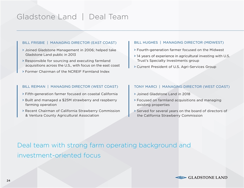Gladstone Land | Deal Team BILL HUGHES | MANAGING DIRECTOR (MIDWEST) BILL FRISBIE | MANAGING DIRECTOR (EAST COAST) > Fourth-generation farmer focused on the Midwest > Joined Gladstone Management in 2006; helped take Gladstone Land public in 2013 > 14 years of experience in agricultural investing with U.S. Trust’s Specialty Investments group > Responsible for sourcing and executing farmland acquisitions across the U.S., with focus on the east coast > Current President of U.S. Agri-Services Group > Former Chairman of the NCREIF Farmland Index BILL REIMAN | MANAGING DIRECTOR (WEST COAST) TONY MARCI | MANAGING DIRECTOR (WEST COAST) > Fifth-generation farmer focused on coastal California > Joined Gladstone Land in 2018 > Built and managed a $25M strawberry and raspberry > Focused on farmland acquisitions and managing farming operation existing properties > Recent Chairman of California Strawberry Commission > Served for several years on the board of directors of & Ventura County Agricultural Association the California Strawberry Commission Deal team with strong farm operating background and investment-oriented focus 24Gladstone Land | Deal Team BILL HUGHES | MANAGING DIRECTOR (MIDWEST) BILL FRISBIE | MANAGING DIRECTOR (EAST COAST) > Fourth-generation farmer focused on the Midwest > Joined Gladstone Management in 2006; helped take Gladstone Land public in 2013 > 14 years of experience in agricultural investing with U.S. Trust’s Specialty Investments group > Responsible for sourcing and executing farmland acquisitions across the U.S., with focus on the east coast > Current President of U.S. Agri-Services Group > Former Chairman of the NCREIF Farmland Index BILL REIMAN | MANAGING DIRECTOR (WEST COAST) TONY MARCI | MANAGING DIRECTOR (WEST COAST) > Fifth-generation farmer focused on coastal California > Joined Gladstone Land in 2018 > Built and managed a $25M strawberry and raspberry > Focused on farmland acquisitions and managing farming operation existing properties > Recent Chairman of California Strawberry Commission > Served for several years on the board of directors of & Ventura County Agricultural Association the California Strawberry Commission Deal team with strong farm operating background and investment-oriented focus 24