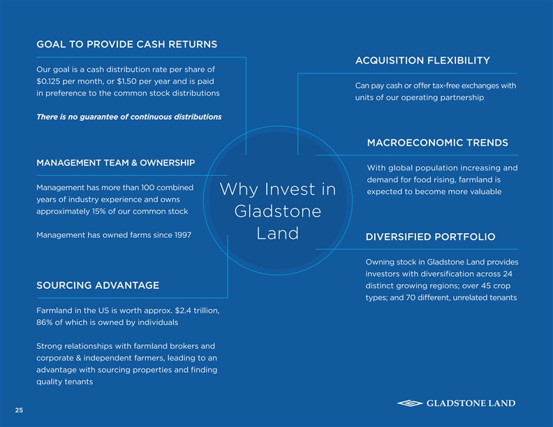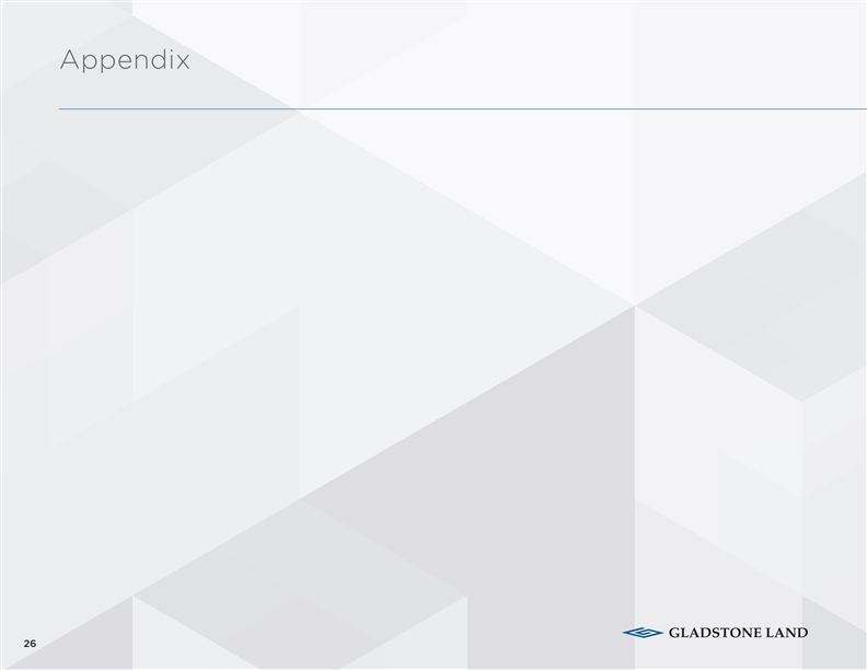 GOAL TO PROVIDE CASH RETURNS ACQUISITION FLEXIBILITY Our goal is a cash distribution rate per share of $0.125 per month, or $1.50 per year and is paid Can pay cash or oer tax-free exchanges with in preference to the common stock distributions units of our operating partnership There is no guarantee of continuous distributions MACROECONOMIC TRENDS MANAGEMENT TEAM & OWNERSHIP With global population increasing and demand for food rising, farmland is Management has more than 100 combined expected to become more valuable Why Invest in years of industry experience and owns approximately 15% of our common stock Gladstone Management has owned farms since 1997 Land DIVERSIFIED PORTFOLIO Owning stock in Gladstone Land provides investors with diversification across 24 distinct growing regions; over 45 crop SOURCING ADVANTAGE types; and 70 dierent, unrelated tenants Farmland in the US is worth approx. $2.4 trillion, 86% of which is owned by individuals Strong relationships with farmland brokers and corporate & independent farmers, leading to an advantage with sourcing properties and finding quality tenants 25GOAL TO PROVIDE CASH RETURNS ACQUISITION FLEXIBILITY Our goal is a cash distribution rate per share of $0.125 per month, or $1.50 per year and is paid Can pay cash or oer tax-free exchanges with in preference to the common stock distributions units of our operating partnership There is no guarantee of continuous distributions MACROECONOMIC TRENDS MANAGEMENT TEAM & OWNERSHIP With global population increasing and demand for food rising, farmland is Management has more than 100 combined expected to become more valuable Why Invest in years of industry experience and owns approximately 15% of our common stock Gladstone Management has owned farms since 1997 Land DIVERSIFIED PORTFOLIO Owning stock in Gladstone Land provides investors with diversification across 24 distinct growing regions; over 45 crop SOURCING ADVANTAGE types; and 70 dierent, unrelated tenants Farmland in the US is worth approx. $2.4 trillion, 86% of which is owned by individuals Strong relationships with farmland brokers and corporate & independent farmers, leading to an advantage with sourcing properties and finding quality tenants 25