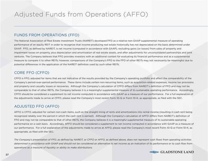 Adjusted Funds from Operations (AFFO) FUNDS FROM OPERATIONS (FFO) The National Association of Real Estate Investment Trusts (NAREIT) developed FFO as a relative non-GAAP supplemental measure of operating performance of an equity REIT in order to recognize that income-producing real estate historically has not depreciated on the basis determined under GAAP. FFO, as defined by NAREIT, is net income (computed in accordance with GAAP), excluding gains (or losses) from sales of property and impairment losses on property, plus depreciation and amortization of real estate assets, and after adjustments for unconsolidated partnerships and joint ventures. The Company believes that FFO provides investors with an additional context for evaluating its financial performance and as a supplemental measure to compare it to other REITs; however, comparisons of the Company’s FFO to the FFO of other REITs may not necessarily be meaningful due to potential dierences in the application of the NAREIT definition used by such other REITs. CORE FFO (CFFO) CFFO is FFO, adjusted for items that are not indicative of the results provided by the Company’s operating portfolio and aect the comparability of the Company’s period-over-period performance. These items include certain non-recurring items, such as acquisition-related expenses, income tax provisions and property and casualty losses or recoveries. Although the Company’s calculation of CFFO diers from NAREIT’s definition of FFO and may not be comparable to that of other REITs, the Company believes it is a meaningful supplemental measure of its sustainable operating performance. Accordingly, CFFO should be considered a supplement to net income computed in accordance with GAAP as a measure of our performance. For a full explanation of the adjustments made to arrive at CFFO, please read the Company’s most recent Form 10-Q or Form 10-K, as appropriate, as filed with the SEC. ADJUSTED FFO (AFFO) AFFO is CFFO, adjusted for certain non-cash items, such as the straight-lining of rents and amortizations into rental income (resulting in cash rent being recognized ratably over the period in which the cash rent is earned). Although the Company’s calculation of AFFO diers from NAREIT’s definition of FFO and may not be comparable to that of other REITs, the Company believes it is a meaningful supplemental measure of its sustainable operating performance on a cash basis. Accordingly, AFFO should be considered a supplement to net income computed in accordance with GAAP as a measure of our performance. For a full explanation of the adjustments made to arrive at AFFO, please read the Company’s most recent Form 10-Q or Form 10-K, as appropriate, as filed with the SEC. The Company’s presentation of FFO, as defined by NAREIT, or CFFO or AFFO, as defined above, does not represent cash flows from operating activities determined in accordance with GAAP and should not be considered an alternative to net income as an indication of its performance or to cash flow from operations as a measure of liquidity or ability to make distributions. 27Adjusted Funds from Operations (AFFO) FUNDS FROM OPERATIONS (FFO) The National Association of Real Estate Investment Trusts (NAREIT) developed FFO as a relative non-GAAP supplemental measure of operating performance of an equity REIT in order to recognize that income-producing real estate historically has not depreciated on the basis determined under GAAP. FFO, as defined by NAREIT, is net income (computed in accordance with GAAP), excluding gains (or losses) from sales of property and impairment losses on property, plus depreciation and amortization of real estate assets, and after adjustments for unconsolidated partnerships and joint ventures. The Company believes that FFO provides investors with an additional context for evaluating its financial performance and as a supplemental measure to compare it to other REITs; however, comparisons of the Company’s FFO to the FFO of other REITs may not necessarily be meaningful due to potential dierences in the application of the NAREIT definition used by such other REITs. CORE FFO (CFFO) CFFO is FFO, adjusted for items that are not indicative of the results provided by the Company’s operating portfolio and aect the comparability of the Company’s period-over-period performance. These items include certain non-recurring items, such as acquisition-related expenses, income tax provisions and property and casualty losses or recoveries. Although the Company’s calculation of CFFO diers from NAREIT’s definition of FFO and may not be comparable to that of other REITs, the Company believes it is a meaningful supplemental measure of its sustainable operating performance. Accordingly, CFFO should be considered a supplement to net income computed in accordance with GAAP as a measure of our performance. For a full explanation of the adjustments made to arrive at CFFO, please read the Company’s most recent Form 10-Q or Form 10-K, as appropriate, as filed with the SEC. ADJUSTED FFO (AFFO) AFFO is CFFO, adjusted for certain non-cash items, such as the straight-lining of rents and amortizations into rental income (resulting in cash rent being recognized ratably over the period in which the cash rent is earned). Although the Company’s calculation of AFFO diers from NAREIT’s definition of FFO and may not be comparable to that of other REITs, the Company believes it is a meaningful supplemental measure of its sustainable operating performance on a cash basis. Accordingly, AFFO should be considered a supplement to net income computed in accordance with GAAP as a measure of our performance. For a full explanation of the adjustments made to arrive at AFFO, please read the Company’s most recent Form 10-Q or Form 10-K, as appropriate, as filed with the SEC. The Company’s presentation of FFO, as defined by NAREIT, or CFFO or AFFO, as defined above, does not represent cash flows from operating activi