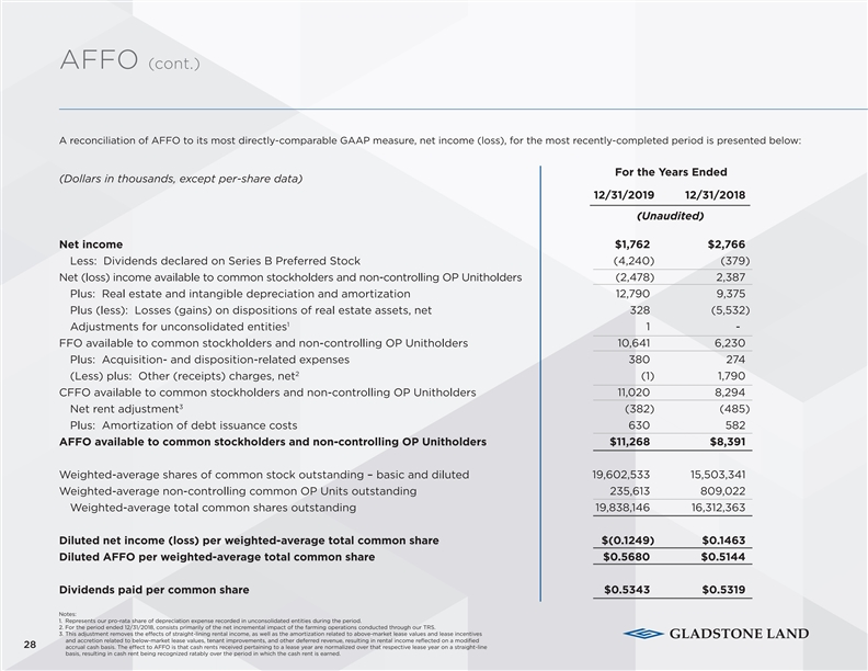 AFFO (cont.) A reconciliation of AFFO to its most directly-comparable GAAP measure, net income (loss), for the most recently-completed period is presented below: For the Years Ended (Dollars in thousands, except per-share data) 12/31/2019 12/31/2018 (Unaudited) Net income $1,762 $2,766 Less: Dividends declared on Series B Preferred Stock (4,240) (379) Net (loss) income available to common stockholders and non-controlling OP Unitholders (2,478) 2,387 Plus: Real estate and intangible depreciation and amortization 12,790 9,375 Plus (less): Losses (gains) on dispositions of real estate assets, net 328 (5,532) 1 Adjustments for unconsolidated entities 1 - FFO available to common stockholders and non-controlling OP Unitholders 10,641 6,230 Plus: Acquisition- and disposition-related expenses 380 274 2 (Less) plus: Other (receipts) charges, net (1) 1,790 CFFO available to common stockholders and non-controlling OP Unitholders 11,020 8,294 3 Net rent adjustment (382) (485) Plus: Amortization of debt issuance costs 630 582 AFFO available to common stockholders and non-controlling OP Unitholders $11,268 $8,391 Weighted-average shares of common stock outstanding – basic and diluted 19,602,533 15,503,341 Weighted-average non-controlling common OP Units outstanding 235,613 809,022 Weighted-average total common shares outstanding 19,838,146 16,312,363 Diluted net income (loss) per weighted-average total common share $(0.1249) $0.1463 Diluted AFFO per weighted-average total common share $0.5680 $0.5144 Dividends paid per common share $0.5343 $0.5319 Notes: 1. Represents our pro-rata share of depreciation expense recorded in unconsolidated entities during the period. 2. For the period ended 12/31/2018, consists primarily of the net incremental impact of the farming operations conducted through our TRS. 3. This adjustment removes the eects of straight-lining rental income, as well as the amortization related to above-market lease values and lease incentives and accretion related to below-market lease values, tenant improvements, and other deferred revenue, resulting in rental income reflected on a modified 28 accrual cash basis. The eect to AFFO is that cash rents received pertaining to a lease year are normalized over that respective lease year on a straight-line basis, resulting in cash rent being recognized ratably over the period in which the cash rent is earned.AFFO (cont.) A reconciliation of AFFO to its most directly-comparable GAAP measure, net income (loss), for the most recently-completed period is presented below: For the Years Ended (Dollars in thousands, except per-share data) 12/31/2019 12/31/2018 (Unaudited) Net income $1,762 $2,766 Less: Dividends declared on Series B Preferred Stock (4,240) (379) Net (loss) income available to common stockholders and non-controlling OP Unitholders (2,478) 2,387 Plus: Real estate and intangible depreciation and amortization 12,790 9,375 Plus (less): Losses (gains) on dispositions of real estate assets, net 328 (5,532) 1 Adjustments for unconsolidated entities 1 - FFO available to common stockholders and non-controlling OP Unitholders 10,641 6,230 Plus: Acquisition- and disposition-related expenses 380 274 2 (Less) plus: Other (receipts) charges, net (1) 1,790 CFFO available to common stockholders and non-controlling OP Unitholders 11,020 8,294 3 Net rent adjustment (382) (485) Plus: Amortization of debt issuance costs 630 582 AFFO available to common stockholders and non-controlling OP Unitholders $11,268 $8,391 Weighted-average shares of common stock outstanding – basic and diluted 19,602,533 15,503,341 Weighted-average non-controlling common OP Units outstanding 235,613 809,022 Weighted-average total common shares outstanding 19,838,146 16,312,363 Diluted net income (loss) per weighted-average total common share $(0.1249) $0.1463 Diluted AFFO per weighted-average total common share $0.5680 $0.5144 Dividends paid per common share $0.5343 $0.5319 Notes: 1. Represents our pro-rata share of depreciation expense recorded in unconsolidated entities during the period. 2. For the period ended 12/31/2018, consists primarily of the net incremental impact of the farming operations conducted through our TRS. 3. This adjustment removes the eects of straight-lining rental income, as well as the amortization related to above-market lease values and lease incentives and accretion related to below-market lease values, tenant improvements, and other deferred revenue, resulting in rental income reflected on a modified 28 accrual cash basis. The eect to AFFO is that cash rents received pertaining to a lease year are normalized over that respective lease year on a straight-line basis, resulting in cash rent being recognized ratably over the period in which the cash rent is earned.