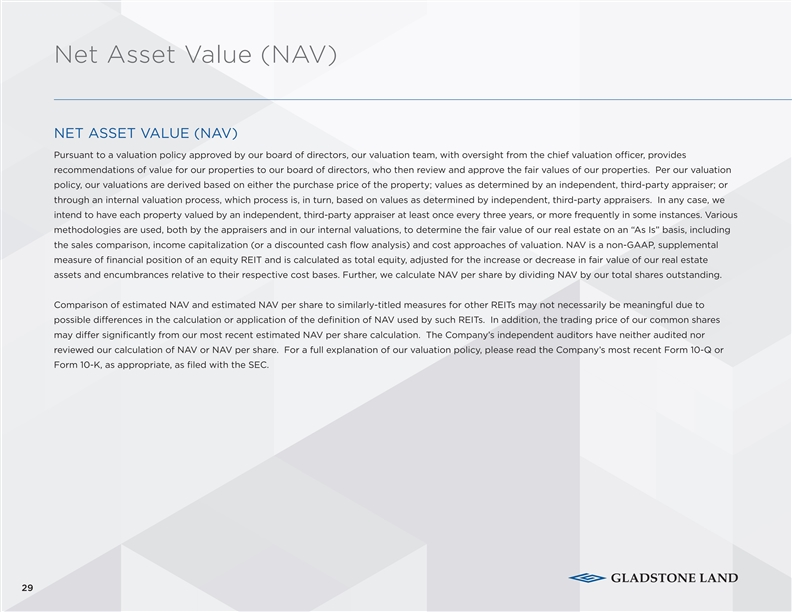 Net Asset Value (NAV) NET ASSET VALUE (NAV) Pursuant to a valuation policy approved by our board of directors, our valuation team, with oversight from the chief valuation ocer, provides recommendations of value for our properties to our board of directors, who then review and approve the fair values of our properties. Per our valuation policy, our valuations are derived based on either the purchase price of the property; values as determined by an independent, third-party appraiser; or through an internal valuation process, which process is, in turn, based on values as determined by independent, third-party appraisers. In any case, we intend to have each property valued by an independent, third-party appraiser at least once every three years, or more frequently in some instances. Various methodologies are used, both by the appraisers and in our internal valuations, to determine the fair value of our real estate on an “As Is” basis, including the sales comparison, income capitalization (or a discounted cash flow analysis) and cost approaches of valuation. NAV is a non-GAAP, supplemental measure of financial position of an equity REIT and is calculated as total equity, adjusted for the increase or decrease in fair value of our real estate assets and encumbrances relative to their respective cost bases. Further, we calculate NAV per share by dividing NAV by our total shares outstanding. Comparison of estimated NAV and estimated NAV per share to similarly-titled measures for other REITs may not necessarily be meaningful due to possible dierences in the calculation or application of the definition of NAV used by such REITs. In addition, the trading price of our common shares may dier significantly from our most recent estimated NAV per share calculation. The Company’s independent auditors have neither audited nor reviewed our calculation of NAV or NAV per share. For a full explanation of our valuation policy, please read the Company’s most recent Form 10-Q or Form 10-K, as appropriate, as filed with the SEC. 29Net Asset Value (NAV) NET ASSET VALUE (NAV) Pursuant to a valuation policy approved by our board of directors, our valuation team, with oversight from the chief valuation ocer, provides recommendations of value for our properties to our board of directors, who then review and approve the fair values of our properties. Per our valuation policy, our valuations are derived based on either the purchase price of the property; values as determined by an independent, third-party appraiser; or through an internal valuation process, which process is, in turn, based on values as determined by independent, third-party appraisers. In any case, we intend to have each property valued by an independent, third-party appraiser at least once every three years, or more frequently in some instances. Various methodologies are used, both by the appraisers and in our internal valuations, to determine the fair value of our real estate on an “As Is” basis, including the sales comparison, income capitalization (or a discounted cash flow analysis) and cost approaches of valuation. NAV is a non-GAAP, supplemental measure of financial position of an equity REIT and is calculated as total equity, adjusted for the increase or decrease in fair value of our real estate assets and encumbrances relative to their respective cost bases. Further, we calculate NAV per share by dividing NAV by our total shares outstanding. Comparison of estimated NAV and estimated NAV per share to similarly-titled measures for other REITs may not necessarily be meaningful due to possible dierences in the calculation or application of the definition of NAV used by such REITs. In addition, the trading price of our common shares may dier significantly from our most recent estimated NAV per share calculation. The Company’s independent auditors have neither audited nor reviewed our calculation of NAV or NAV per share. For a full explanation of our valuation policy, please read the Company’s most recent Form 10-Q or Form 10-K, as appropriate, as filed with the SEC. 29