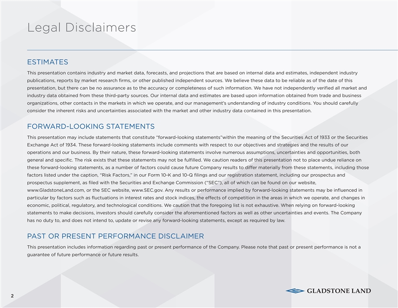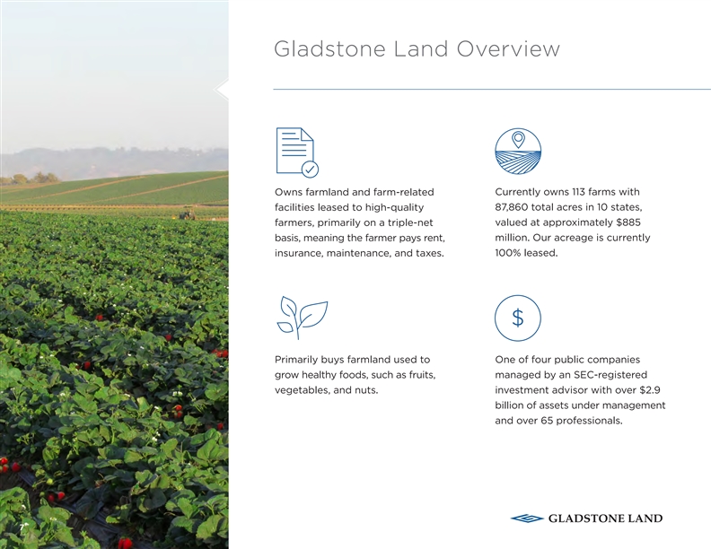 Legal Disclaimers ESTIMATES This presentation contains industry and market data, forecasts, and projections that are based on internal data and estimates, independent industry publications, reports by market research firms, or other published independent sources. We believe these data to be reliable as of the date of this presentation, but there can be no assurance as to the accuracy or completeness of such information. We have not independently verified all market and industry data obtained from these third-party sources. Our internal data and estimates are based upon information obtained from trade and business organizations, other contacts in the markets in which we operate, and our management’s understanding of industry conditions. You should carefully consider the inherent risks and uncertainties associated with the market and other industry data contained in this presentation. FORWARD-LOOKING STATEMENTS This presentation may include statements that constitute “forward-looking statements”within the meaning of the Securities Act of 1933 or the Securities Exchange Act of 1934. These forward-looking statements include comments with respect to our objectives and strategies and the results of our operations and our business. By their nature, these forward-looking statements involve numerous assumptions, uncertainties and opportunities, both general and specific. The risk exists that these statements may not be fulfilled. We caution readers of this presentation not to place undue reliance on these forward-looking statements, as a number of factors could cause future Company results to dier materially from these statements, including those factors listed under the caption, “Risk Factors,” in our Form 10-K and 10-Q filings and our registration statement, including our prospectus and prospectus supplement, as filed with the Securities and Exchange Commission (“SEC”), all of which can be found on our website, www.GladstoneLand.com, or the SEC website, www.SEC.gov. Any results or performance implied by forward-looking statements may be influenced in particular by factors such as fluctuations in interest rates and stock indices, the eects of competition in the areas in which we operate, and changes in economic, political, regulatory, and technological conditions. We caution that the foregoing list is not exhaustive. When relying on forward-looking statements to make decisions, investors should carefully consider the aforementioned factors as well as other uncertainties and events. The Company has no duty to, and does not intend to, update or revise any forward-looking statements, except as required by law. PAST OR PRESENT PERFORMANCE DISCLAIMER This presentation includes information regarding past or present performance of the Company. Please note that past or present performance is not a guarantee of future performance or future results. 2Legal Disclaimers ESTIMATES This presentation contains industry and market data, forecasts, and projections that are based on internal data and estimates, independent industry publications, reports by market research firms, or other published independent sources. We believe these data to be reliable as of the date of this presentation, but there can be no assurance as to the accuracy or completeness of such information. We have not independently verified all market and industry data obtained from these third-party sources. Our internal data and estimates are based upon information obtained from trade and business organizations, other contacts in the markets in which we operate, and our management’s understanding of industry conditions. You should carefully consider the inherent risks and uncertainties associated with the market and other industry data contained in this presentation. FORWARD-LOOKING STATEMENTS This presentation may include statements that constitute “forward-looking statements”within the meaning of the Securities Act of 1933 or the Securities Exchange Act of 1934. These forward-looking statements include comments with respect to our objectives and strategies and the results of our operations and our business. By their nature, these forward-looking statements involve numerous assumptions, uncertainties and opportunities, both general and specific. The risk exists that these statements may not be fulfilled. We caution readers of this presentation not to place undue reliance on these forward-looking statements, as a number of factors could cause future Company results to dier materially from these statements, including those factors listed under the caption, “Risk Factors,” in our Form 10-K and 10-Q filings and our registration statement, including our prospectus and prospectus supplement, as filed with the Securities and Exchange Commission (“SEC”), all of which can be found on our website, www.GladstoneLand.com, or the SEC website, www.SEC.gov. Any results or performance implied by forward-looking statements may be influenced in particular by factors such as fluctuations in interest rates and stock indices, the eects of competition in the areas in which we operate, and changes in economic, political, regulatory, and technological conditions. We caution that the foregoing list is not exhaustive. When relying on forward-looking statements to make decisions, investors should carefully consider the aforementioned factors as well as other uncertainties and events. The Company has no duty to, and does not intend to, update or revise any forward-looking statements, except as required by law. PAST OR PRESENT PERFORMANCE DISCLAIMER This presentation includes information regarding past or present performance of the Company. Please note that past or present performance is not a guarantee of future performance or future results. 2