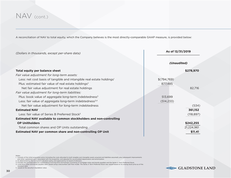 NAV (cont.) A reconciliation of NAV to total equity, which the Company believes is the most directly-comparable GAAP measure, is provided below: As of 12/31/2019 (Dollars in thousands, except per-share data) (Unaudited) Total equity per balance sheet $278,970 Fair value adjustment for long-term assets: 1 Less: net cost basis of tangible and intangible real estate holdings $(794,769) 2 Plus: estimated fair value of real estate holdings 877,485 Net fair value adjustment for real estate holdings 82,716 Fair value adjustment for long-term liabilities: 3 Plus: book value of aggregate long-term indebtedness 513,699 3,4 Less: fair value of aggregate long-term indebtedness (514,233) Net fair value adjustment for long-term indebtedness (534) Estimated NAV 361,152 5 Less: fair value of Series B Preferred Stock (118,897) Estimated NAV available to common stockholders and non-controlling OP Unitholders $242,255 Total common shares and OP Units outstanding 21,224,961 Estimated NAV per common share and non-controlling OP Unit $11.41 Notes: 1. Consists of the initial acquisition price (including the costs allocated to both tangible and intangible assets acquired and liabilities assumed), plus subsequent improvements and other capitalized costs associated with the properties, and adjusted for accumulated depreciation and amortization. 2. As determined by the Company's valuation policy and approved by its board of directors. 3. Includes the principal balances outstanding of all long-term borrowings (consisting of mortgage notes and bonds payable) and the Series A Term Preferred Stock. 4. Long-term notes and bonds payable were valued using a discounted cash flow model. The Series A Term Preferred Stock was valued based on its closing stock price as of the valuation date. 5. Valued at the security's liquidation value. 30NAV (cont.) A reconciliation of NAV to total equity, which the Company believes is the most directly-comparable GAAP measure, is provided below: As of 12/31/2019 (Dollars in thousands, except per-share data) (Unaudited) Total equity per balance sheet $278,970 Fair value adjustment for long-term assets: 1 Less: net cost basis of tangible and intangible real estate holdings $(794,769) 2 Plus: estimated fair value of real estate holdings 877,485 Net fair value adjustment for real estate holdings 82,716 Fair value adjustment for long-term liabilities: 3 Plus: book value of aggregate long-term indebtedness 513,699 3,4 Less: fair value of aggregate long-term indebtedness (514,233) Net fair value adjustment for long-term indebtedness (534) Estimated NAV 361,152 5 Less: fair value of Series B Preferred Stock (118,897) Estimated NAV available to common stockholders and non-controlling OP Unitholders $242,255 Total common shares and OP Units outstanding 21,224,961 Estimated NAV per common share and non-controlling OP Unit $11.41 Notes: 1. Consists of the initial acquisition price (including the costs allocated to both tangible and intangible assets acquired and liabilities assumed), plus subsequent improvements and other capitalized costs associated with the properties, and adjusted for accumulated depreciation and amortization. 2. As determined by the Company's valuation policy and approved by its board of directors. 3. Includes the principal balances outstanding of all long-term borrowings (consisting of mortgage notes and bonds payable) and the Series A Term Preferred Stock. 4. Long-term notes and bonds payable were valued using a discounted cash flow model. The Series A Term Preferred Stock was valued based on its closing stock price as of the valuation date. 5. Valued at the security's liquidation value. 30