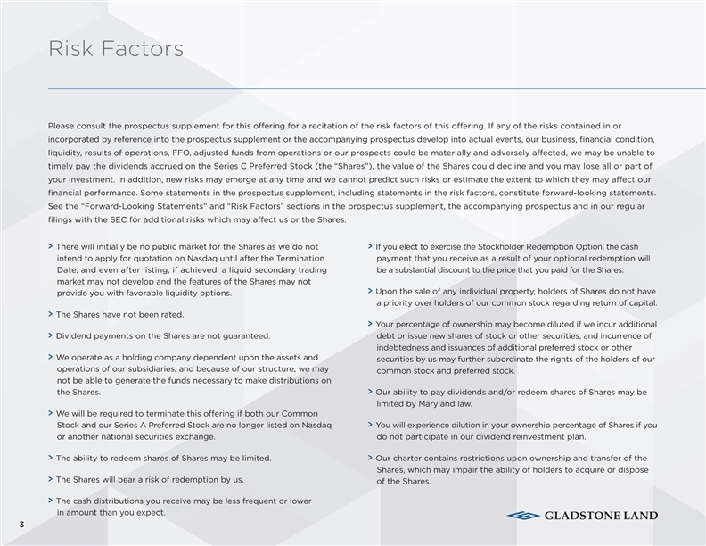 Risk Factors Please consult the prospectus supplement for this oering for a recitation of the risk factors of this oering. If any of the risks contained in or incorporated by reference into the prospectus supplement or the accompanying prospectus develop into actual events, our business, financial condition, liquidity, results of operations, FFO, adjusted funds from operations or our prospects could be materially and adversely aected, we may be unable to timely pay the dividends accrued on the Series C Preferred Stock (the “Shares”), the value of the Shares could decline and you may lose all or part of your investment. In addition, new risks may emerge at any time and we cannot predict such risks or estimate the extent to which they may aect our financial performance. Some statements in the prospectus supplement, including statements in the risk factors, constitute forward-looking statements. See the “Forward-Looking Statements” and “Risk Factors” sections in the prospectus supplement, the accompanying prospectus and in our regular filings with the SEC for additional risks which may aect us or the Shares. > There will initially be no public market for the Shares as we do not > If you elect to exercise the Stockholder Redemption Option, the cash intend to apply for quotation on Nasdaq until after the Termination payment that you receive as a result of your optional redemption will Date, and even after listing, if achieved, a liquid secondary trading be a substantial discount to the price that you paid for the Shares. market may not develop and the features of the Shares may not > Upon the sale of any individual property, holders of Shares do not have provide you with favorable liquidity options. a priority over holders of our common stock regarding return of capital. > The Shares have not been rated. > Your percentage of ownership may become diluted if we incur additional > Dividend payments on the Shares are not guaranteed. debt or issue new shares of stock or other securities, and incurrence of indebtedness and issuances of additional preferred stock or other > We operate as a holding company dependent upon the assets and securities by us may further subordinate the rights of the holders of our operations of our subsidiaries, and because of our structure, we may common stock and preferred stock. not be able to generate the funds necessary to make distributions on the Shares. > Our ability to pay dividends and/or redeem shares of Shares may be limited by Maryland law. > We will be required to terminate this oering if both our Common Stock and our Series A Preferred Stock are no longer listed on Nasdaq > You will experience dilution in your ownership percentage of Shares if you or another national securities exchange. do not participate in our dividend reinvestment plan. > The ability to redeem shares of Shares may be limited. > Our charter contains restrictions upon ownership and transfer of the Shares, which may impair the ability of holders to acquire or dispose > The Shares will bear a risk of redemption by us. of the Shares. > The cash distributions you receive may be less frequent or lower in amount than you expect. 3Risk Factors Please consult the prospectus supplement for this oering for a recitation of the risk factors of this oering. If any of the risks contained in or incorporated by reference into the prospectus supplement or the accompanying prospectus develop into actual events, our business, financial condition, liquidity, results of operations, FFO, adjusted funds from operations or our prospects could be materially and adversely aected, we may be unable to timely pay the dividends accrued on the Series C Preferred Stock (the “Shares”), the value of the Shares could decline and you may lose all or part of your investment. In addition, new risks may emerge at any time and we cannot predict such risks or estimate the extent to which they may aect our financial performance. Some statements in the prospectus supplement, including statements in the risk factors, constitute forward-looking statements. See the “Forward-Looking Statements” and “Risk Factors” sections in the prospectus supplement, the accompanying prospectus and in our regular filings with the SEC for additional risks which may aect us or the Shares. > There will initially be no public market for the Shares as we do not > If you elect to exercise the Stockholder Redemption Option, the cash intend to apply for quotation on Nasdaq until after the Termination payment that you receive as a result of your optional redemption will Date, and even after listing, if achieved, a liquid secondary trading be a substantial discount to the price that you paid for the Shares. market may not develop and the features of the Shares may not > Upon the sale of any individual property, holders of Shares do not have provide you with favorable liquidity options. a priority over holders of our common stock regarding return of capital. > The Shares have not been rated. > Your percentage of ownership may become diluted if we incur additional > Dividend payments on the Shares are not guaranteed. debt or issue new shares of stock or other securities, and incurrence of indebtedness and issuances of additional preferred stock or other > We operate as a holding company dependent upon the assets and securities by us may further subordinate the rights of the holders of our operations of our subsidiaries, and because of our structure, we may common stock and preferred stock. not be able to generate the funds necessary to make distributions on the Shares. > Our ability to pay dividends and/or redeem shares of Shares may be limited by Maryland law. > We will be required to terminate this oering if both our Common Stock and our Series A Preferred Stock are no longer listed on Nasdaq > You will experience dilution in your ownership percentage of Shares if you or another national securities exchange. do not participate in our div
