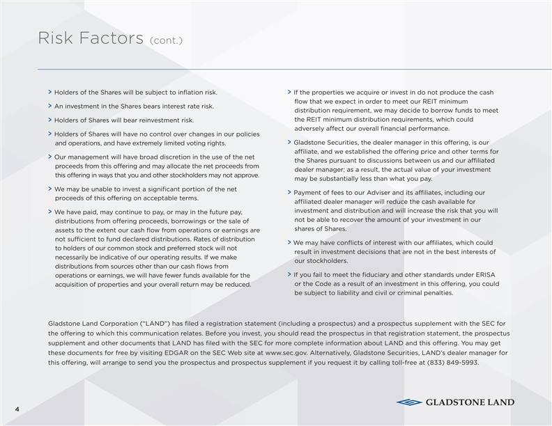 Risk Factors (cont.) > Holders of the Shares will be subject to inflation risk. > If the properties we acquire or invest in do not produce the cash flow that we expect in order to meet our REIT minimum > An investment in the Shares bears interest rate risk. distribution requirement, we may decide to borrow funds to meet the REIT minimum distribution requirements, which could > Holders of Shares will bear reinvestment risk. adversely aect our overall financial performance. > Holders of Shares will have no control over changes in our policies > Gladstone Securities, the dealer manager in this oering, is our and operations, and have extremely limited voting rights. aliate, and we established the oering price and other terms for > Our management will have broad discretion in the use of the net the Shares pursuant to discussions between us and our aliated proceeds from this oering and may allocate the net proceeds from dealer manager; as a result, the actual value of your investment this oering in ways that you and other stockholders may not approve. may be substantially less than what you pay. > We may be unable to invest a significant portion of the net > Payment of fees to our Adviser and its aliates, including our proceeds of this oering on acceptable terms. aliated dealer manager will reduce the cash available for investment and distribution and will increase the risk that you will > We have paid, may continue to pay, or may in the future pay, not be able to recover the amount of your investment in our distributions from oering proceeds, borrowings or the sale of shares of Shares. assets to the extent our cash flow from operations or earnings are not sucient to fund declared distributions. Rates of distribution > We may have conflicts of interest with our aliates, which could to holders of our common stock and preferred stock will not result in investment decisions that are not in the best interests of necessarily be indicative of our operating results. If we make our stockholders. distributions from sources other than our cash flows from > If you fail to meet the fiduciary and other standards under ERISA operations or earnings, we will have fewer funds available for the or the Code as a result of an investment in this oering, you could acquisition of properties and your overall return may be reduced. be subject to liability and civil or criminal penalties. Gladstone Land Corporation (“LAND”) has filed a registration statement (including a prospectus) and a prospectus supplement with the SEC for the oering to which this communication relates. Before you invest, you should read the prospectus in that registration statement, the prospectus supplement and other documents that LAND has filed with the SEC for more complete information about LAND and this oering. You may get these documents for free by visiting EDGAR on the SEC Web site at www.sec.gov. Alternatively, Gladstone Securities, LAND’s dealer manager for this oering, will arrange to send you the prospectus and prospectus supplement if you request it by calling toll-free at (833) 849-5993. 4Risk Factors (cont.) > Holders of the Shares will be subject to inflation risk. > If the properties we acquire or invest in do not produce the cash flow that we expect in order to meet our REIT minimum > An investment in the Shares bears interest rate risk. distribution requirement, we may decide to borrow funds to meet the REIT minimum distribution requirements, which could > Holders of Shares will bear reinvestment risk. adversely aect our overall financial performance. > Holders of Shares will have no control over changes in our policies > Gladstone Securities, the dealer manager in this oering, is our and operations, and have extremely limited voting rights. aliate, and we established the oering price and other terms for > Our management will have broad discretion in the use of the net the Shares pursuant to discussions between us and our aliated proceeds from this oering and may allocate the net proceeds from dealer manager; as a result, the actual value of your investment this oering in ways that you and other stockholders may not approve. may be substantially less than what you pay. > We may be unable to invest a significant portion of the net > Payment of fees to our Adviser and its aliates, including our proceeds of this oering on acceptable terms. aliated dealer manager will reduce the cash available for investment and distribution and will increase the risk that you will > We have paid, may continue to pay, or may in the future pay, not be able to recover the amount of your investment in our distributions from oering proceeds, borrowings or the sale of shares of Shares. assets to the extent our cash flow from operations or earnings are not sucient to fund declared distributions. Rates of distribution > We may have conflicts of interest with our aliates, which could to holders of our common stock and preferred stock will not result in investment decisions that are not in the best interests of necessarily be indicative of our operating results. If we make our stockholders. distributions from sources other than our cash flows from > If you fail to meet the fiduciary and other standards under ERISA operations or earnings, we will have fewer funds available for the or the Code as a result of an investment in this oering, you could acquisition of properties and your overall return may be reduced. be subject to liability and civil or criminal penalties. Gladstone Land Corporation (“LAND”) has filed a registration statement (including a prospectus) and a prospectus supplement with the SEC for the oering to which this communication relates. Before you invest, you should read the prospectus in that registration statement, the prospectus supplement and other documents that LAND has filed with the SEC for more complete information about LAND and this oering. You may get these documents for free by visiting EDGAR on the SEC Web site at www.