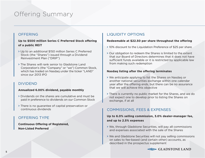 Oering Summary OFFERING LIQUIDITY OPTIONS Up to $500 million Series C Preferred Stock oering Redeemable at $22.50 per share throughout the oering of a public REIT > 10% discount to the Liquidation Preference of $25 per share > Up to an additional $150 million Series C Preferred > Our obligation to redeem the Shares is limited to the extent Stock (the “Shares”) issued through a Dividend that our Board of Directors determines that it does not have Reinvestment Plan (“DRIP”) sucient funds available or it is restricted by applicable law from making such redemption > The Shares will rank senior to Gladstone Land Corporation’s (the “Company” or “we”) Common Stock, which has traded on Nasdaq under the ticker “LAND” Nasdaq listing after the oering terminates since our 2013 IPO > We anticipate applying to list the Shares on Nasdaq or another national securities exchange within one calendar DIVIDEND year after the oering ends, but there can be no assurance that we will achieve this objective Annualized 6.00% dividend, payable monthly > There is currently no public market for the Shares, and we do > Dividends on the shares are cumulative and must be not expect one to develop prior to listing the Shares on paid in preference to dividends on our Common Stock exchange, if at all > There is no guarantee of capital preservation or continuous dividends COMMISSIONS, FEES & EXPENSES Up to 6.0% selling commission, 3.0% dealer-manager fee, OFFERING TYPE and up to 2.5% expenses Continuous Oering of Registered, > We, through Gladstone Securities, will pay all commissions Non-Listed Preferred and expenses associated with the sale of the Shares > We and Gladstone Securities will not pay selling commissions on sales to fee-based (and certain other) accounts, as described in the prospectus supplement 5Oering Summary OFFERING LIQUIDITY OPTIONS Up to $500 million Series C Preferred Stock oering Redeemable at $22.50 per share throughout the oering of a public REIT > 10% discount to the Liquidation Preference of $25 per share > Up to an additional $150 million Series C Preferred > Our obligation to redeem the Shares is limited to the extent Stock (the “Shares”) issued through a Dividend that our Board of Directors determines that it does not have Reinvestment Plan (“DRIP”) sucient funds available or it is restricted by applicable law from making such redemption > The Shares will rank senior to Gladstone Land Corporation’s (the “Company” or “we”) Common Stock, which has traded on Nasdaq under the ticker “LAND” Nasdaq listing after the oering terminates since our 2013 IPO > We anticipate applying to list the Shares on Nasdaq or another national securities exchange within one calendar DIVIDEND year after the oering ends, but there can be no assurance that we will achieve this objective Annualized 6.00% dividend, payable monthly > There is currently no public market for the Shares, and we do > Dividends on the shares are cumulative and must be not expect one to develop prior to listing the Shares on paid in preference to dividends on our Common Stock exchange, if at all > There is no guarantee of capital preservation or continuous dividends COMMISSIONS, FEES & EXPENSES Up to 6.0% selling commission, 3.0% dealer-manager fee, OFFERING TYPE and up to 2.5% expenses Continuous Oering of Registered, > We, through Gladstone Securities, will pay all commissions Non-Listed Preferred and expenses associated with the sale of the Shares > We and Gladstone Securities will not pay selling commissions on sales to fee-based (and certain other) accounts, as described in the prospectus supplement 5