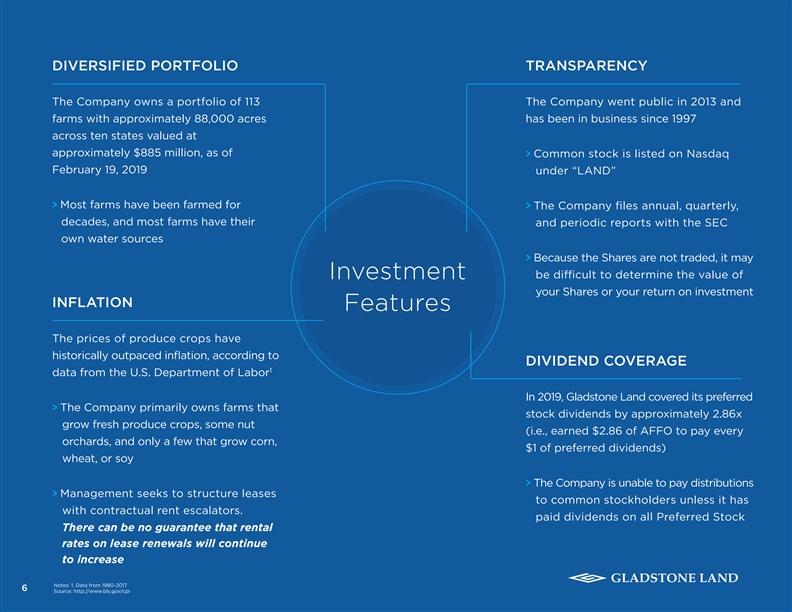 DIVERSIFIED PORTFOLIO TRANSPARENCY The Company owns a portfolio of 113 The Company went public in 2013 and farms with approximately 88,000 acres has been in business since 1997 across ten states valued at approximately $885 million, as of > Common stock is listed on Nasdaq February 19, 2019 under “LAND” > Most farms have been farmed for > The Company files annual, quarterly, decades, and most farms have their and periodic reports with the SEC own water sources > Because the Shares are not traded, it may be dicult to determine the value of Investment your Shares or your return on investment INFLATION Features The prices of produce crops have historically outpaced inflation, according to DIVIDEND COVERAGE 1 data from the U.S. Department of Labor In 2019, Gladstone Land covered its preferred > The Company primarily owns farms that stock dividends by approximately 2.86x grow fresh produce crops, some nut (i.e., earned $2.86 of AFFO to pay every orchards, and only a few that grow corn, $1 of preferred dividends) wheat, or soy > The Company is unable to pay distributions > Management seeks to structure leases to common stockholders unless it has with contractual rent escalators. paid dividends on all Preferred Stock There can be no guarantee that rental rates on lease renewals will continue to increase Notes: 1. Data from 1980-2017 6 Source: http://www.bls.gov/cpiDIVERSIFIED PORTFOLIO TRANSPARENCY The Company owns a portfolio of 113 The Company went public in 2013 and farms with approximately 88,000 acres has been in business since 1997 across ten states valued at approximately $885 million, as of > Common stock is listed on Nasdaq February 19, 2019 under “LAND” > Most farms have been farmed for > The Company files annual, quarterly, decades, and most farms have their and periodic reports with the SEC own water sources > Because the Shares are not traded, it may be dicult to determine the value of Investment your Shares or your return on investment INFLATION Features The prices of produce crops have historically outpaced inflation, according to DIVIDEND COVERAGE 1 data from the U.S. Department of Labor In 2019, Gladstone Land covered its preferred > The Company primarily owns farms that stock dividends by approximately 2.86x grow fresh produce crops, some nut (i.e., earned $2.86 of AFFO to pay every orchards, and only a few that grow corn, $1 of preferred dividends) wheat, or soy > The Company is unable to pay distributions > Management seeks to structure leases to common stockholders unless it has with contractual rent escalators. paid dividends on all Preferred Stock There can be no guarantee that rental rates on lease renewals will continue to increase Notes: 1. Data from 1980-2017 6 Source: http://www.bls.gov/cpi