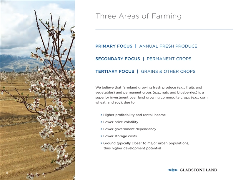 Gladstone Land Overview Owns farmland and farm-related Currently owns 113 farms with facilities leased to high-quality 87,860 total acres in 10 states, farmers, primarily on a triple-net valued at approximately $885 basis, meaning the farmer pays rent, million. Our acreage is currently insurance, maintenance, and taxes. 100% leased. $ Primarily buys farmland used to One of four public companies grow healthy foods, such as fruits, managed by an SEC-registered vegetables, and nuts. investment advisor with over $2.9 billion of assets under management and over 65 professionals. 7Gladstone Land Overview Owns farmland and farm-related Currently owns 113 farms with facilities leased to high-quality 87,860 total acres in 10 states, farmers, primarily on a triple-net valued at approximately $885 basis, meaning the farmer pays rent, million. Our acreage is currently insurance, maintenance, and taxes. 100% leased. $ Primarily buys farmland used to One of four public companies grow healthy foods, such as fruits, managed by an SEC-registered vegetables, and nuts. investment advisor with over $2.9 billion of assets under management and over 65 professionals. 7