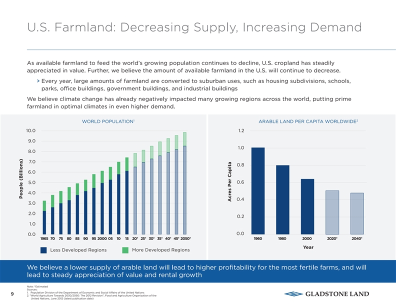 U.S. Farmland: Decreasing Supply, Increasing Demand As available farmland to feed the world’s growing population continues to decline, U.S. cropland has steadily appreciated in value . Further, we believe the amount of available farmland in the U.S. will continue to decrease. > Every year, large amounts of farmland are converted to suburban uses, such as housing subdivisions, schools, parks, oce buildings, government buildings, and industrial buildings We believe climate change has already negatively impacted many growing regions across the world, putting prime farmland in optimal climates in even higher demand. 1 2 WORLD POPULATION ARABLE LAND PER CAPITA WORLDWIDE 10.0 1.2 9.0 1.0 8.0 7.0 0.8 6.0 0.6 5.0 4.0 0.4 3.0 2.0 0.2 1.0 0.0 0.0 1965 70 75 80 85 90 95 2000 05 10 15 20* 25* 30* 35* 40* 45* 2050* 1960 1980 2000 2020* 2040* Year Less Developed Regions More Developed Regions We believe a lower supply of arable land will lead to higher profitability for the most fertile farms, and will lead to steady appreciation of value and rental growth Note: *Estimated Sources: 1. Population Division of the Department of Economic and Social Aairs of the United Nations 9 2. “World Agriculture Towards 2030/2050: The 2012 Revision”, Food and Agriculture Organization of the United Nations, June 2012 (latest publication date) People (Billions) Acres Per CapitaU.S. Farmland: Decreasing Supply, Increasing Demand As available farmland to feed the world’s growing population continues to decline, U.S. cropland has steadily appreciated in value . Further, we believe the amount of available farmland in the U.S. will continue to decrease. > Every year, large amounts of farmland are converted to suburban uses, such as housing subdivisions, schools, parks, oce buildings, government buildings, and industrial buildings We believe climate change has already negatively impacted many growing regions across the world, putting prime farmland in optimal climates in even higher demand. 1 2 WORLD POPULATION ARABLE LAND PER CAPITA WORLDWIDE 10.0 1.2 9.0 1.0 8.0 7.0 0.8 6.0 0.6 5.0 4.0 0.4 3.0 2.0 0.2 1.0 0.0 0.0 1965 70 75 80 85 90 95 2000 05 10 15 20* 25* 30* 35* 40* 45* 2050* 1960 1980 2000 2020* 2040* Year Less Developed Regions More Developed Regions We believe a lower supply of arable land will lead to higher profitability for the most fertile farms, and will lead to steady appreciation of value and rental growth Note: *Estimated Sources: 1. Population Division of the Department of Economic and Social Aairs of the United Nations 9 2. “World Agriculture Towards 2030/2050: The 2012 Revision”, Food and Agriculture Organization of the United Nations, June 2012 (latest publication date) People (Billions) Acres Per Capita