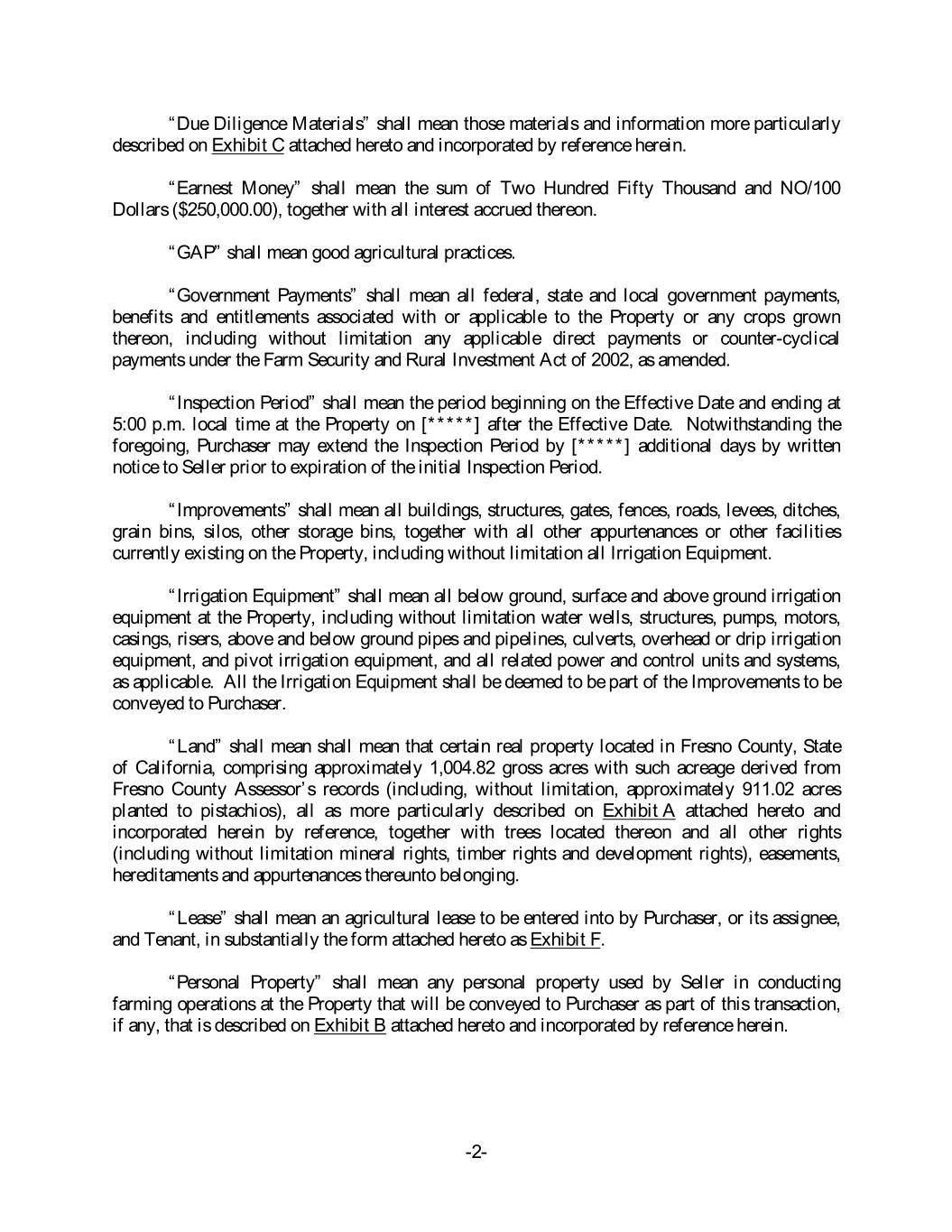“Due Diligence Materials” shall mean those materials and information more particularly described on Exhibit C attached hereto and incorporated by reference herein. “Earnest Money” shall mean the sum of Two Hundred Fifty Thousand and NO/100 Dollars ($250,000.00), together with all interest accrued thereon. “GAP” shall mean good agricultural practices. “Government Payments” shall mean all federal, state and local government payments, benefits and entitlements associated with or applicable to the Property or any crops grown thereon, including without limitation any applicable direct payments or counter-cyclical payments under the Farm Security and Rural Investment Act of 2002, as amended. “Inspection Period” shall mean the period beginning on the Effective Date and ending at 5:00 p.m. local time at the Property on [*****] after the Effective Date. Notwithstanding the foregoing, Purchaser may extend the Inspection Period by [*****] additional days by written notice to Seller prior to expiration of the initial Inspection Period. “Improvements” shall mean all buildings, structures, gates, fences, roads, levees, ditches, grain bins, silos, other storage bins, together with all other appurtenances or other facilities currently existing on the Property, including without limitation all Irrigation Equipment. “Irrigation Equipment” shall mean all below ground, surface and above ground irrigation equipment at the Property, including without limitation water wells, structures, pumps, motors, casings, risers, above and below ground pipes and pipelines, culverts, overhead or drip irrigation equipment, and pivot irrigation equipment, and all related power and control units and systems, as applicable. All the Irrigation Equipment shall be deemed to be part of the Improvements to be conveyed to Purchaser. “Land” shall mean shall mean that certain real property located in Fresno County, State of California, comprising approximately 1,004.82 gross acres with such acreage derived from Fresno County Assessor’s records (including, without limitation, approximately 911.02 acres planted to pistachios), all as more particularly described on Exhibit A attached hereto and incorporated herein by reference, together with trees located thereon and all other rights (including without limitation mineral rights, timber rights and development rights), easements, hereditaments and appurtenances thereunto belonging. “Lease” shall mean an agricultural lease to be entered into by Purchaser, or its assignee, and Tenant, in substantially the form attached hereto as Exhibit F. “Personal Property” shall mean any personal property used by Seller in conducting farming operations at the Property that will be conveyed to Purchaser as part of this transaction, if any, that is described on Exhibit B attached hereto and incorporated by reference herein. -2-