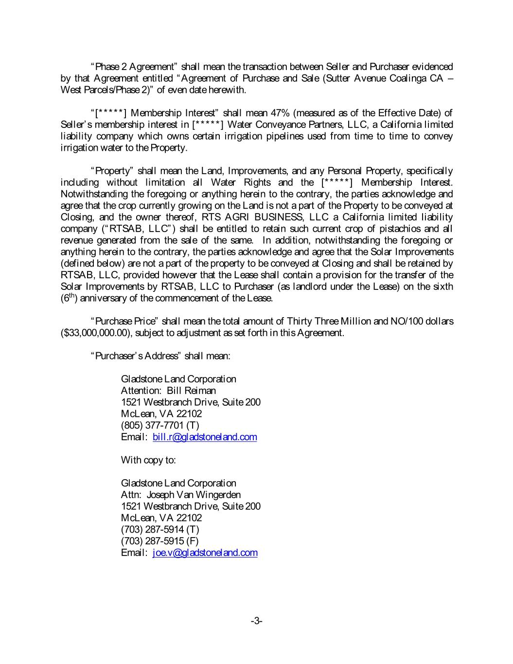 “Phase 2 Agreement” shall mean the transaction between Seller and Purchaser evidenced by that Agreement entitled “Agreement of Purchase and Sale (Sutter Avenue Coalinga CA – West Parcels/Phase 2)” of even date herewith. “[*****] Membership Interest” shall mean 47% (measured as of the Effective Date) of Seller’s membership interest in [*****] Water Conveyance Partners, LLC, a California limited liability company which owns certain irrigation pipelines used from time to time to convey irrigation water to the Property. “Property” shall mean the Land, Improvements, and any Personal Property, specifically including without limitation all Water Rights and the [*****] Membership Interest. Notwithstanding the foregoing or anything herein to the contrary, the parties acknowledge and agree that the crop currently growing on the Land is not a part of the Property to be conveyed at Closing, and the owner thereof, RTS AGRI BUSINESS, LLC a California limited liability company (“RTSAB, LLC”) shall be entitled to retain such current crop of pistachios and all revenue generated from the sale of the same. In addition, notwithstanding the foregoing or anything herein to the contrary, the parties acknowledge and agree that the Solar Improvements (defined below) are not a part of the property to be conveyed at Closing and shall be retained by RTSAB, LLC, provided however that the Lease shall contain a provision for the transfer of the Solar Improvements by RTSAB, LLC to Purchaser (as landlord under the Lease) on the sixth (6th) anniversary of the commencement of the Lease. “Purchase Price” shall mean the total amount of Thirty Three Million and NO/100 dollars ($33,000,000.00), subject to adjustment as set forth in this Agreement. “Purchaser’s Address” shall mean: Gladstone Land Corporation Attention: Bill Reiman 1521 Westbranch Drive, Suite 200 McLean, VA 22102 (805) 377-7701 (T) Email: bill.r@gladstoneland.com With copy to: Gladstone Land Corporation Attn: Joseph Van Wingerden 1521 Westbranch Drive, Suite 200 McLean, VA 22102 (703) 287-5914 (T) (703) 287-5915 (F) Email: joe.v@gladstoneland.com -3-