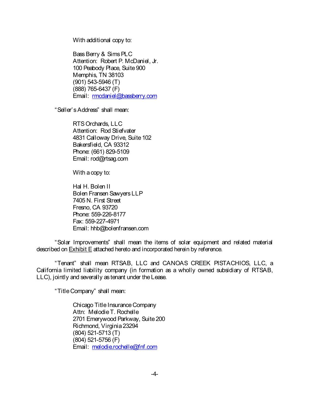 With additional copy to: Bass Berry & Sims PLC Attention: Robert P. McDaniel, Jr. 100 Peabody Place, Suite 900 Memphis, TN 38103 (901) 543-5946 (T) (888) 765-6437 (F) Email: rmcdaniel@bassberry.com “Seller’s Address” shall mean: RTS Orchards, LLC Attention: Rod Stiefvater 4831 Calloway Drive, Suite 102 Bakersfield, CA 93312 Phone: (661) 829-5109 Email: rod@rtsag.com With a copy to: Hal H. Bolen II Bolen Fransen Sawyers LLP 7405 N. First Street Fresno, CA 93720 Phone: 559-226-8177 Fax: 559-227-4971 Email: hhb@bolenfransen.com “Solar Improvements” shall mean the items of solar equipment and related material described on Exhibit E attached hereto and incorporated herein by reference. “Tenant” shall mean RTSAB, LLC and CANOAS CREEK PISTACHIOS, LLC, a California limited liability company (in formation as a wholly owned subsidiary of RTSAB, LLC), jointly and severally as tenant under the Lease. “Title Company” shall mean: Chicago Title Insurance Company Attn: Melodie T. Rochelle 2701 Emerywood Parkway, Suite 200 Richmond, Virginia 23294 (804) 521-5713 (T) (804) 521-5756 (F) Email: melodie.rochelle@fnf.com -4-