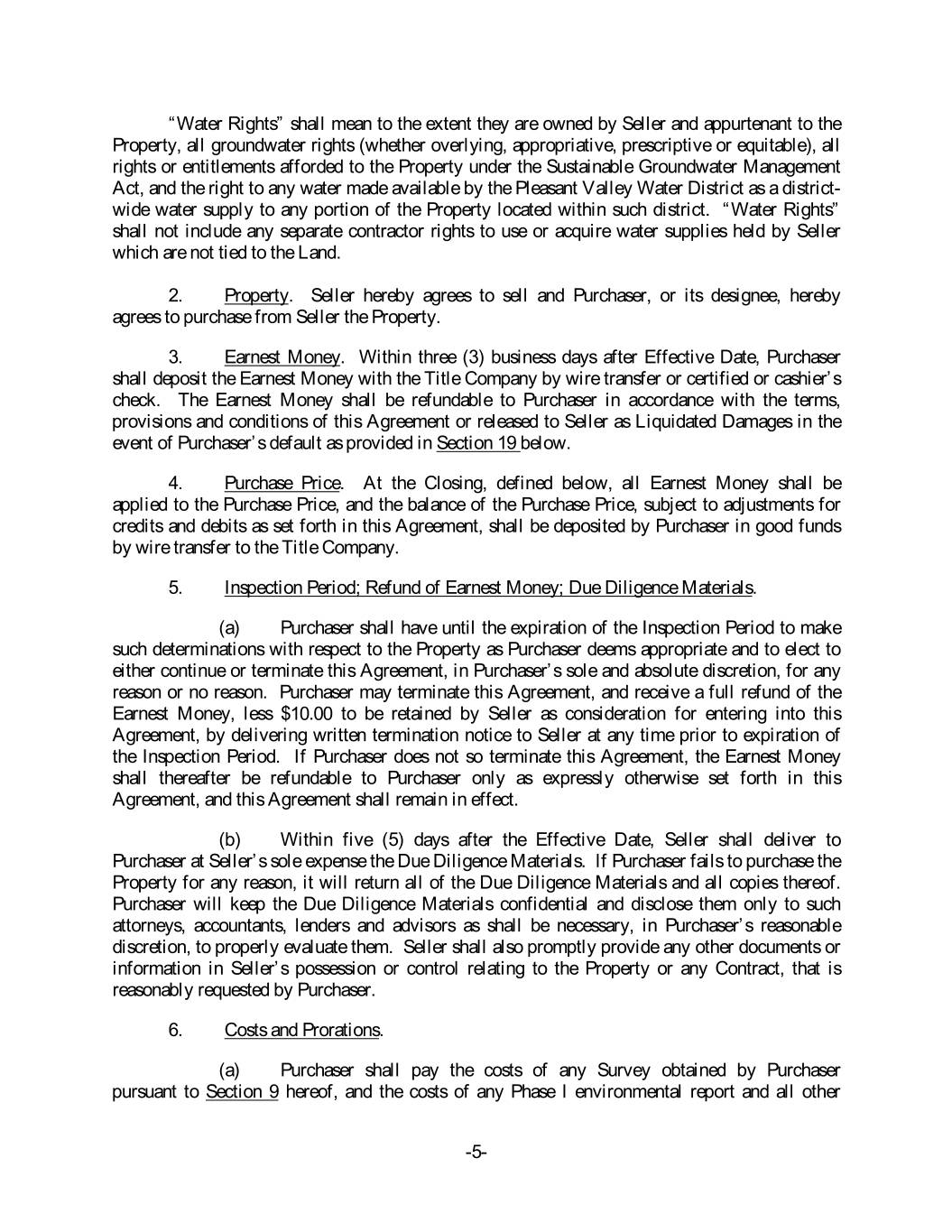 “Water Rights” shall mean to the extent they are owned by Seller and appurtenant to the Property, all groundwater rights (whether overlying, appropriative, prescriptive or equitable), all rights or entitlements afforded to the Property under the Sustainable Groundwater Management Act, and the right to any water made available by the Pleasant Valley Water District as a district- wide water supply to any portion of the Property located within such district. “Water Rights” shall not include any separate contractor rights to use or acquire water supplies held by Seller which are not tied to the Land. 2. Property. Seller hereby agrees to sell and Purchaser, or its designee, hereby agrees to purchase from Seller the Property. 3. Earnest Money. Within three (3) business days after Effective Date, Purchaser shall deposit the Earnest Money with the Title Company by wire transfer or certified or cashier’s check. The Earnest Money shall be refundable to Purchaser in accordance with the terms, provisions and conditions of this Agreement or released to Seller as Liquidated Damages in the event of Purchaser’s default as provided in Section 19 below. 4. Purchase Price. At the Closing, defined below, all Earnest Money shall be applied to the Purchase Price, and the balance of the Purchase Price, subject to adjustments for credits and debits as set forth in this Agreement, shall be deposited by Purchaser in good funds by wire transfer to the Title Company. 5. Inspection Period; Refund of Earnest Money; Due Diligence Materials. (a) Purchaser shall have until the expiration of the Inspection Period to make such determinations with respect to the Property as Purchaser deems appropriate and to elect to either continue or terminate this Agreement, in Purchaser’s sole and absolute discretion, for any reason or no reason. Purchaser may terminate this Agreement, and receive a full refund of the Earnest Money, less $10.00 to be retained by Seller as consideration for entering into this Agreement, by delivering written termination notice to Seller at any time prior to expiration of the Inspection Period. If Purchaser does not so terminate this Agreement, the Earnest Money shall thereafter be refundable to Purchaser only as expressly otherwise set forth in this Agreement, and this Agreement shall remain in effect. (b) Within five (5) days after the Effective Date, Seller shall deliver to Purchaser at Seller’s sole expense the Due Diligence Materials. If Purchaser fails to purchase the Property for any reason, it will return all of the Due Diligence Materials and all copies thereof. Purchaser will keep the Due Diligence Materials confidential and disclose them only to such attorneys, accountants, lenders and advisors as shall be necessary, in Purchaser’s reasonable discretion, to properly evaluate them. Seller shall also promptly provide any other documents or information in Seller’s possession or control relating to the Property or any Contract, that is reasonably requested by Purchaser. 6. Costs and Prorations. (a) Purchaser shall pay the costs of any Survey obtained by Purchaser pursuant to Section 9 hereof, and the costs of any Phase I environmental report and all other -5-