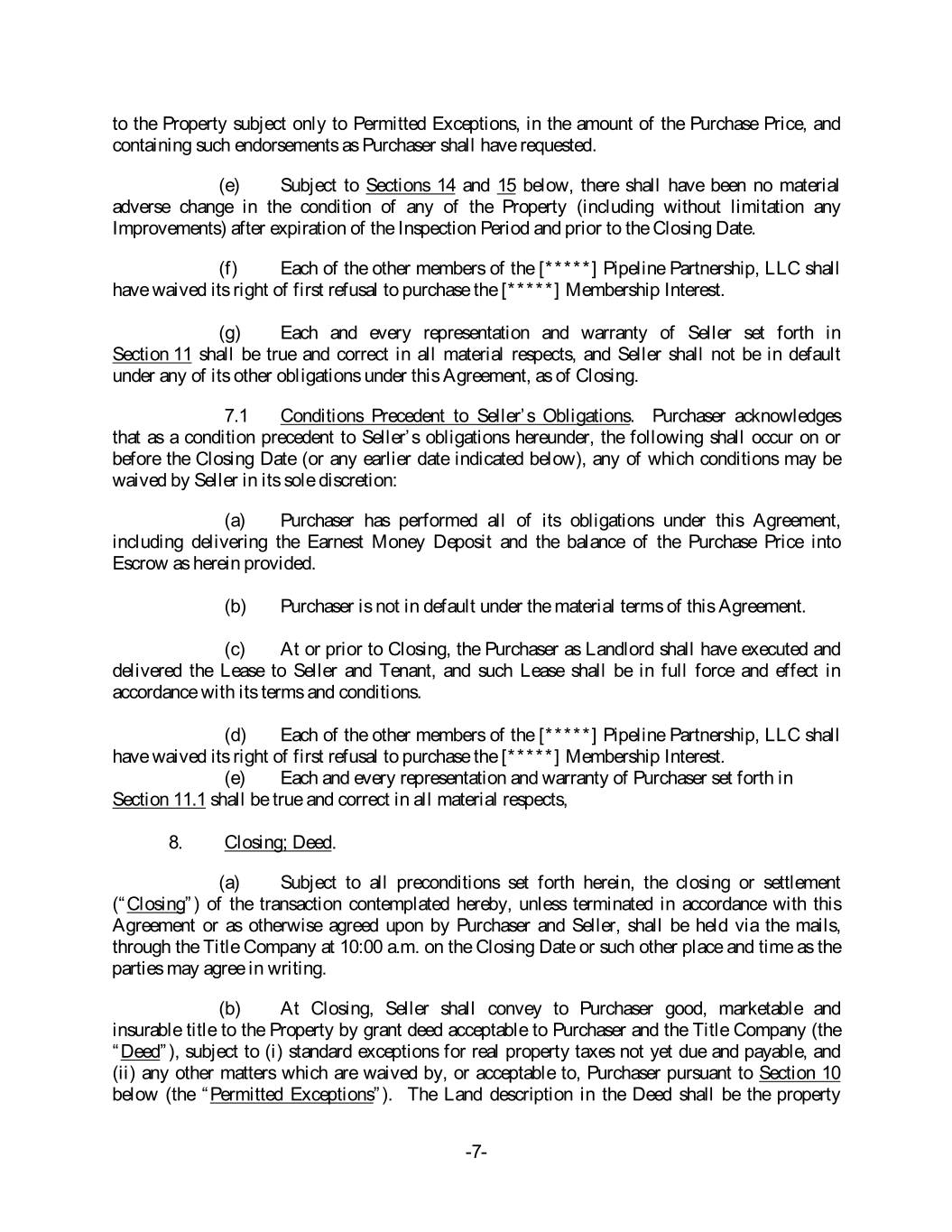 to the Property subject only to Permitted Exceptions, in the amount of the Purchase Price, and containing such endorsements as Purchaser shall have requested. (e) Subject to Sections 14 and 15 below, there shall have been no material adverse change in the condition of any of the Property (including without limitation any Improvements) after expiration of the Inspection Period and prior to the Closing Date. (f) Each of the other members of the [*****] Pipeline Partnership, LLC shall have waived its right of first refusal to purchase the [*****] Membership Interest. (g) Each and every representation and warranty of Seller set forth in Section 11 shall be true and correct in all material respects, and Seller shall not be in default under any of its other obligations under this Agreement, as of Closing. 7.1 Conditions Precedent to Seller’s Obligations. Purchaser acknowledges that as a condition precedent to Seller’s obligations hereunder, the following shall occur on or before the Closing Date (or any earlier date indicated below), any of which conditions may be waived by Seller in its sole discretion: (a) Purchaser has performed all of its obligations under this Agreement, including delivering the Earnest Money Deposit and the balance of the Purchase Price into Escrow as herein provided. (b) Purchaser is not in default under the material terms of this Agreement. (c) At or prior to Closing, the Purchaser as Landlord shall have executed and delivered the Lease to Seller and Tenant, and such Lease shall be in full force and effect in accordance with its terms and conditions. (d) Each of the other members of the [*****] Pipeline Partnership, LLC shall have waived its right of first refusal to purchase the [*****] Membership Interest. (e) Each and every representation and warranty of Purchaser set forth in Section 11.1 shall be true and correct in all material respects, 8. Closing; Deed. (a) Subject to all preconditions set forth herein, the closing or settlement (“Closing”) of the transaction contemplated hereby, unless terminated in accordance with this Agreement or as otherwise agreed upon by Purchaser and Seller, shall be held via the mails, through the Title Company at 10:00 a.m. on the Closing Date or such other place and time as the parties may agree in writing. (b) At Closing, Seller shall convey to Purchaser good, marketable and insurable title to the Property by grant deed acceptable to Purchaser and the Title Company (the “Deed”), subject to (i) standard exceptions for real property taxes not yet due and payable, and (ii) any other matters which are waived by, or acceptable to, Purchaser pursuant to Section 10 below (the “Permitted Exceptions”). The Land description in the Deed shall be the property -7-