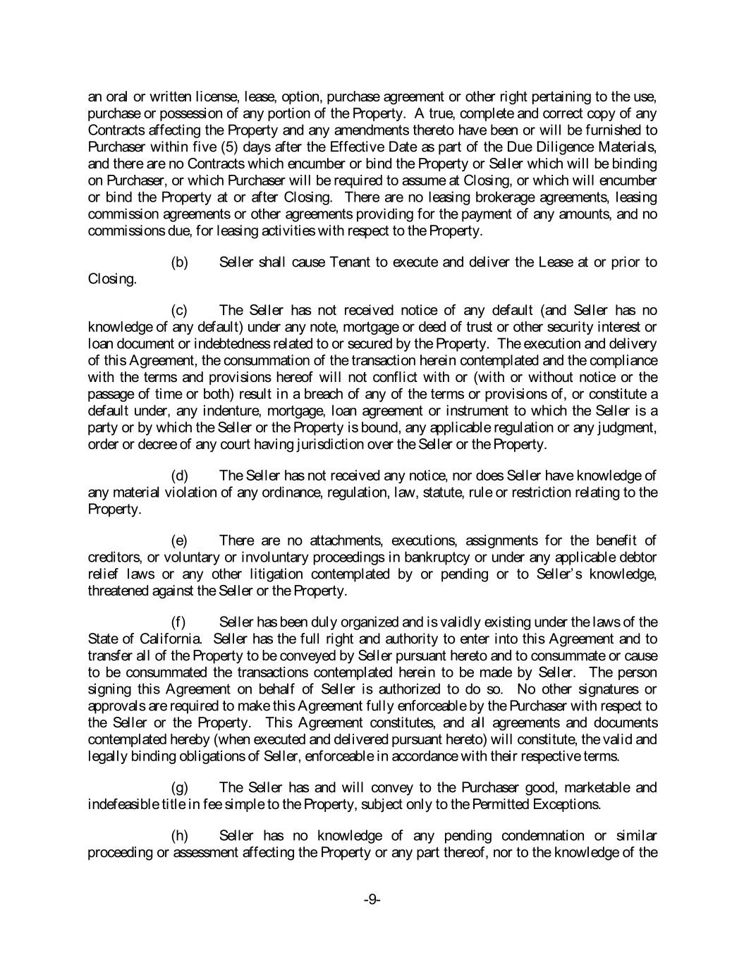 an oral or written license, lease, option, purchase agreement or other right pertaining to the use, purchase or possession of any portion of the Property. A true, complete and correct copy of any Contracts affecting the Property and any amendments thereto have been or will be furnished to Purchaser within five (5) days after the Effective Date as part of the Due Diligence Materials, and there are no Contracts which encumber or bind the Property or Seller which will be binding on Purchaser, or which Purchaser will be required to assume at Closing, or which will encumber or bind the Property at or after Closing. There are no leasing brokerage agreements, leasing commission agreements or other agreements providing for the payment of any amounts, and no commissions due, for leasing activities with respect to the Property. (b) Seller shall cause Tenant to execute and deliver the Lease at or prior to Closing. (c) The Seller has not received notice of any default (and Seller has no knowledge of any default) under any note, mortgage or deed of trust or other security interest or loan document or indebtedness related to or secured by the Property. The execution and delivery of this Agreement, the consummation of the transaction herein contemplated and the compliance with the terms and provisions hereof will not conflict with or (with or without notice or the passage of time or both) result in a breach of any of the terms or provisions of, or constitute a default under, any indenture, mortgage, loan agreement or instrument to which the Seller is a party or by which the Seller or the Property is bound, any applicable regulation or any judgment, order or decree of any court having jurisdiction over the Seller or the Property. (d) The Seller has not received any notice, nor does Seller have knowledge of any material violation of any ordinance, regulation, law, statute, rule or restriction relating to the Property. (e) There are no attachments, executions, assignments for the benefit of creditors, or voluntary or involuntary proceedings in bankruptcy or under any applicable debtor relief laws or any other litigation contemplated by or pending or to Seller’s knowledge, threatened against the Seller or the Property. (f) Seller has been duly organized and is validly existing under the laws of the State of California. Seller has the full right and authority to enter into this Agreement and to transfer all of the Property to be conveyed by Seller pursuant hereto and to consummate or cause to be consummated the transactions contemplated herein to be made by Seller. The person signing this Agreement on behalf of Seller is authorized to do so. No other signatures or approvals are required to make this Agreement fully enforceable by the Purchaser with respect to the Seller or the Property. This Agreement constitutes, and all agreements and documents contemplated hereby (when executed and delivered pursuant hereto) will constitute, the valid and legally binding obligations of Seller, enforceable in accordance with their respective terms. (g) The Seller has and will convey to the Purchaser good, marketable and indefeasible title in fee simple to the Property, subject only to the Permitted Exceptions. (h) Seller has no knowledge of any pending condemnation or similar proceeding or assessment affecting the Property or any part thereof, nor to the knowledge of the -9-