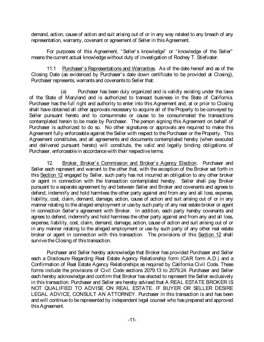 demand, action, cause of action and suit arising out of or in any way related to any breach of any representation, warranty, covenant or agreement of Seller in this Agreement. For purposes of this Agreement, “Seller’s knowledge” or “knowledge of the Seller” means the current actual knowledge without duty of investigation of Rodney T. Stiefvater. 11.1 Purchaser’s Representations and Warranties. As of the date hereof and as of the Closing Date (as evidenced by Purchaser’s date down certificate to be provided at Closing), Purchaser represents, warrants and covenants to Seller that: (a) Purchaser has been duly organized and is validly existing under the laws of the State of Maryland and is authorized to transact business in the State of California. Purchaser has the full right and authority to enter into this Agreement and, at or prior to Closing shall have obtained all other approvals necessary to acquire all of the Property to be conveyed by Seller pursuant hereto and to consummate or cause to be consummated the transactions contemplated herein to be made by Purchaser. The person signing this Agreement on behalf of Purchaser is authorized to do so. No other signatures or approvals are required to make this Agreement fully enforceable against the Seller with respect to the Purchaser or the Property. This Agreement constitutes, and all agreements and documents contemplated hereby (when executed and delivered pursuant hereto) will constitute, the valid and legally binding obligations of Purchaser, enforceable in accordance with their respective terms. 12. Broker, Broker’s Commission and Broker’s Agency Election. Purchaser and Seller each represent and warrant to the other that, with the exception of the Broker set forth in this Section 12 engaged by Seller, such party has not incurred an obligation to any other broker or agent in connection with the transaction contemplated hereby. Seller shall pay Broker pursuant to a separate agreement by and between Seller and Broker and covenants and agrees to defend, indemnify and hold harmless the other party against and from any and all loss, expense, liability, cost, claim, demand, damage, action, cause of action and suit arising out of or in any manner relating to the alleged employment or use by such party of any real estate broker or agent in connection Seller’s agreement with Broker. In addition, each party hereby covenants and agrees to defend, indemnify and hold harmless the other party against and from any and all loss, expense, liability, cost, claim, demand, damage, action, cause of action and suit arising out of or in any manner relating to the alleged employment or use by such party of any other real estate broker or agent in connection with this transaction. The provisions of this Section 12 shall survive the Closing of this transaction. Purchaser and Seller hereby acknowledge that Broker has provided Purchaser and Seller each a Disclosure Regarding Real Estate Agency Relationship form (CAR form A.D.) and a Confirmation of Real Estate Agency Relationships as required by California Civil Code. These forms include the provisions of Civil Code sections 2079.13 to 2079.24. Purchaser and Seller each hereby acknowledge and confirm that Broker has elected to represent the Seller exclusively in this transaction. Purchaser and Seller are hereby advised that A REAL ESTATE BROKER IS NOT QUALIFIED TO ADVISE ON REAL ESTATE. IF BUYER OR SELLER DESIRE LEGAL ADVICE, CONSULT AN ATTORNEY. Purchaser in this transaction is and has been and will continue to be represented by independent legal counsel who has prepared and approved this Agreement. -11-