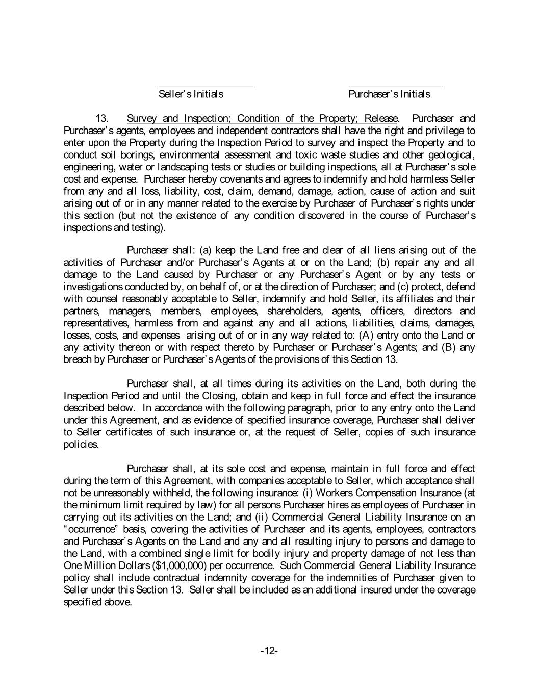 Seller’s Initials Purchaser’s Initials 13. Survey and Inspection; Condition of the Property; Release. Purchaser and Purchaser’s agents, employees and independent contractors shall have the right and privilege to enter upon the Property during the Inspection Period to survey and inspect the Property and to conduct soil borings, environmental assessment and toxic waste studies and other geological, engineering, water or landscaping tests or studies or building inspections, all at Purchaser’s sole cost and expense. Purchaser hereby covenants and agrees to indemnify and hold harmless Seller from any and all loss, liability, cost, claim, demand, damage, action, cause of action and suit arising out of or in any manner related to the exercise by Purchaser of Purchaser’s rights under this section (but not the existence of any condition discovered in the course of Purchaser’s inspections and testing). Purchaser shall: (a) keep the Land free and clear of all liens arising out of the activities of Purchaser and/or Purchaser’s Agents at or on the Land; (b) repair any and all damage to the Land caused by Purchaser or any Purchaser’s Agent or by any tests or investigations conducted by, on behalf of, or at the direction of Purchaser; and (c) protect, defend with counsel reasonably acceptable to Seller, indemnify and hold Seller, its affiliates and their partners, managers, members, employees, shareholders, agents, officers, directors and representatives, harmless from and against any and all actions, liabilities, claims, damages, losses, costs, and expenses arising out of or in any way related to: (A) entry onto the Land or any activity thereon or with respect thereto by Purchaser or Purchaser’s Agents; and (B) any breach by Purchaser or Purchaser’s Agents of the provisions of this Section 13. Purchaser shall, at all times during its activities on the Land, both during the Inspection Period and until the Closing, obtain and keep in full force and effect the insurance described below. In accordance with the following paragraph, prior to any entry onto the Land under this Agreement, and as evidence of specified insurance coverage, Purchaser shall deliver to Seller certificates of such insurance or, at the request of Seller, copies of such insurance policies. Purchaser shall, at its sole cost and expense, maintain in full force and effect during the term of this Agreement, with companies acceptable to Seller, which acceptance shall not be unreasonably withheld, the following insurance: (i) Workers Compensation Insurance (at the minimum limit required by law) for all persons Purchaser hires as employees of Purchaser in carrying out its activities on the Land; and (ii) Commercial General Liability Insurance on an “occurrence” basis, covering the activities of Purchaser and its agents, employees, contractors and Purchaser’s Agents on the Land and any and all resulting injury to persons and damage to the Land, with a combined single limit for bodily injury and property damage of not less than One Million Dollars ($1,000,000) per occurrence. Such Commercial General Liability Insurance policy shall include contractual indemnity coverage for the indemnities of Purchaser given to Seller under this Section 13. Seller shall be included as an additional insured under the coverage specified above. -12-