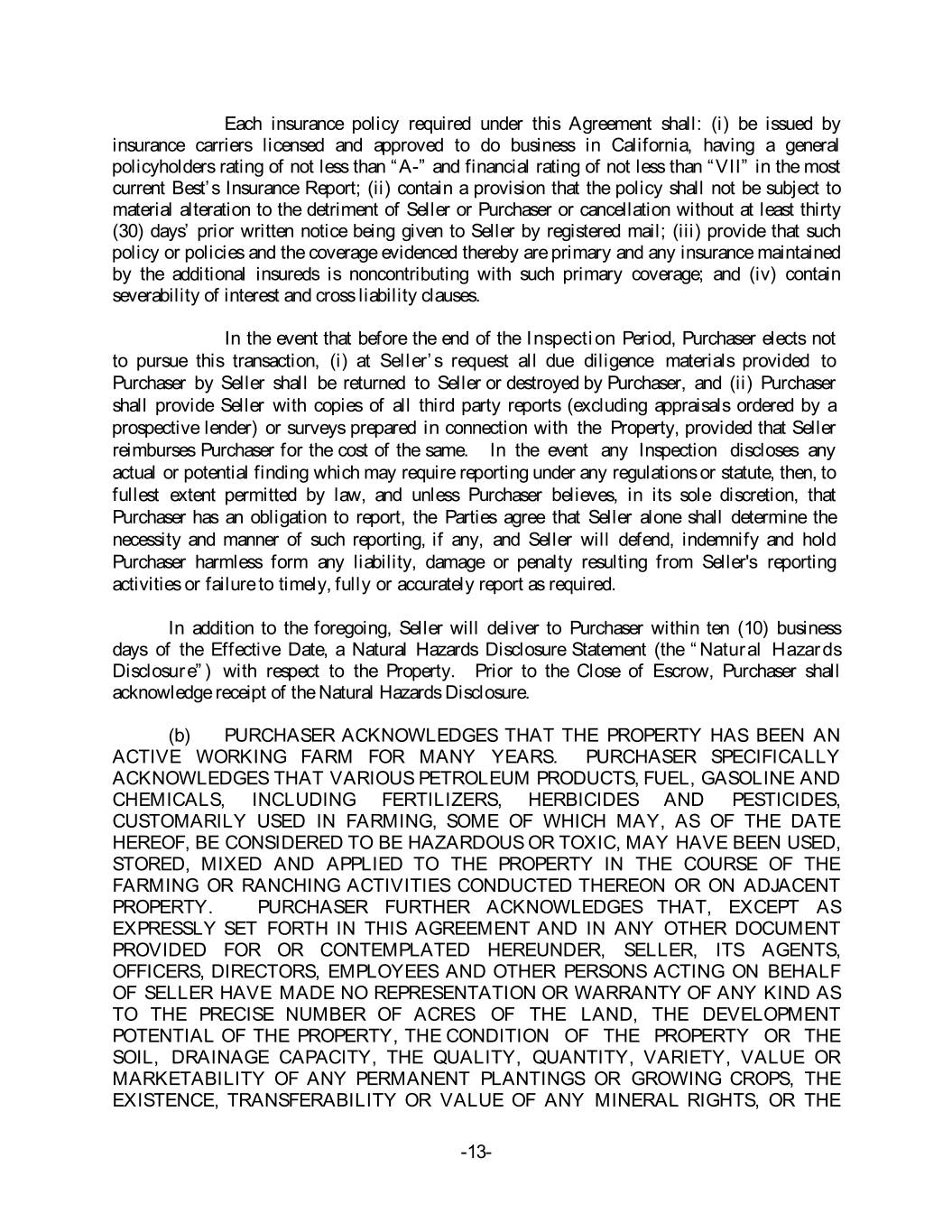 Each insurance policy required under this Agreement shall: (i) be issued by insurance carriers licensed and approved to do business in California, having a general policyholders rating of not less than “A-” and financial rating of not less than “VII” in the most current Best’s Insurance Report; (ii) contain a provision that the policy shall not be subject to material alteration to the detriment of Seller or Purchaser or cancellation without at least thirty (30) days’ prior written notice being given to Seller by registered mail; (iii) provide that such policy or policies and the coverage evidenced thereby are primary and any insurance maintained by the additional insureds is noncontributing with such primary coverage; and (iv) contain severability of interest and cross liability clauses. In the event that before the end of the Inspection Period, Purchaser elects not to pursue this transaction, (i) at Seller’s request all due diligence materials provided to Purchaser by Seller shall be returned to Seller or destroyed by Purchaser, and (ii) Purchaser shall provide Seller with copies of all third party reports (excluding appraisals ordered by a prospective lender) or surveys prepared in connection with the Property, provided that Seller reimburses Purchaser for the cost of the same. In the event any Inspection discloses any actual or potential finding which may require reporting under any regulations or statute, then, to fullest extent permitted by law, and unless Purchaser believes, in its sole discretion, that Purchaser has an obligation to report, the Parties agree that Seller alone shall determine the necessity and manner of such reporting, if any, and Seller will defend, indemnify and hold Purchaser harmless form any liability, damage or penalty resulting from Seller's reporting activities or failure to timely, fully or accurately report as required. In addition to the foregoing, Seller will deliver to Purchaser within ten (10) business days of the Effective Date, a Natural Hazards Disclosure Statement (the “Natural Hazards Disclosure”) with respect to the Property. Prior to the Close of Escrow, Purchaser shall acknowledge receipt of the Natural Hazards Disclosure. (b) PURCHASER ACKNOWLEDGES THAT THE PROPERTY HAS BEEN AN ACTIVE WORKING FARM FOR MANY YEARS. PURCHASER SPECIFICALLY ACKNOWLEDGES THAT VARIOUS PETROLEUM PRODUCTS, FUEL, GASOLINE AND CHEMICALS, INCLUDING FERTILIZERS, HERBICIDES AND PESTICIDES, CUSTOMARILY USED IN FARMING, SOME OF WHICH MAY, AS OF THE DATE HEREOF, BE CONSIDERED TO BE HAZARDOUS OR TOXIC, MAY HAVE BEEN USED, STORED, MIXED AND APPLIED TO THE PROPERTY IN THE COURSE OF THE FARMING OR RANCHING ACTIVITIES CONDUCTED THEREON OR ON ADJACENT PROPERTY. PURCHASER FURTHER ACKNOWLEDGES THAT, EXCEPT AS EXPRESSLY SET FORTH IN THIS AGREEMENT AND IN ANY OTHER DOCUMENT PROVIDED FOR OR CONTEMPLATED HEREUNDER, SELLER, ITS AGENTS, OFFICERS, DIRECTORS, EMPLOYEES AND OTHER PERSONS ACTING ON BEHALF OF SELLER HAVE MADE NO REPRESENTATION OR WARRANTY OF ANY KIND AS TO THE PRECISE NUMBER OF ACRES OF THE LAND, THE DEVELOPMENT POTENTIAL OF THE PROPERTY, THE CONDITION OF THE PROPERTY OR THE SOIL, DRAINAGE CAPACITY, THE QUALITY, QUANTITY, VARIETY, VALUE OR MARKETABILITY OF ANY PERMANENT PLANTINGS OR GROWING CROPS, THE EXISTENCE, TRANSFERABILITY OR VALUE OF ANY MINERAL RIGHTS, OR THE -13-