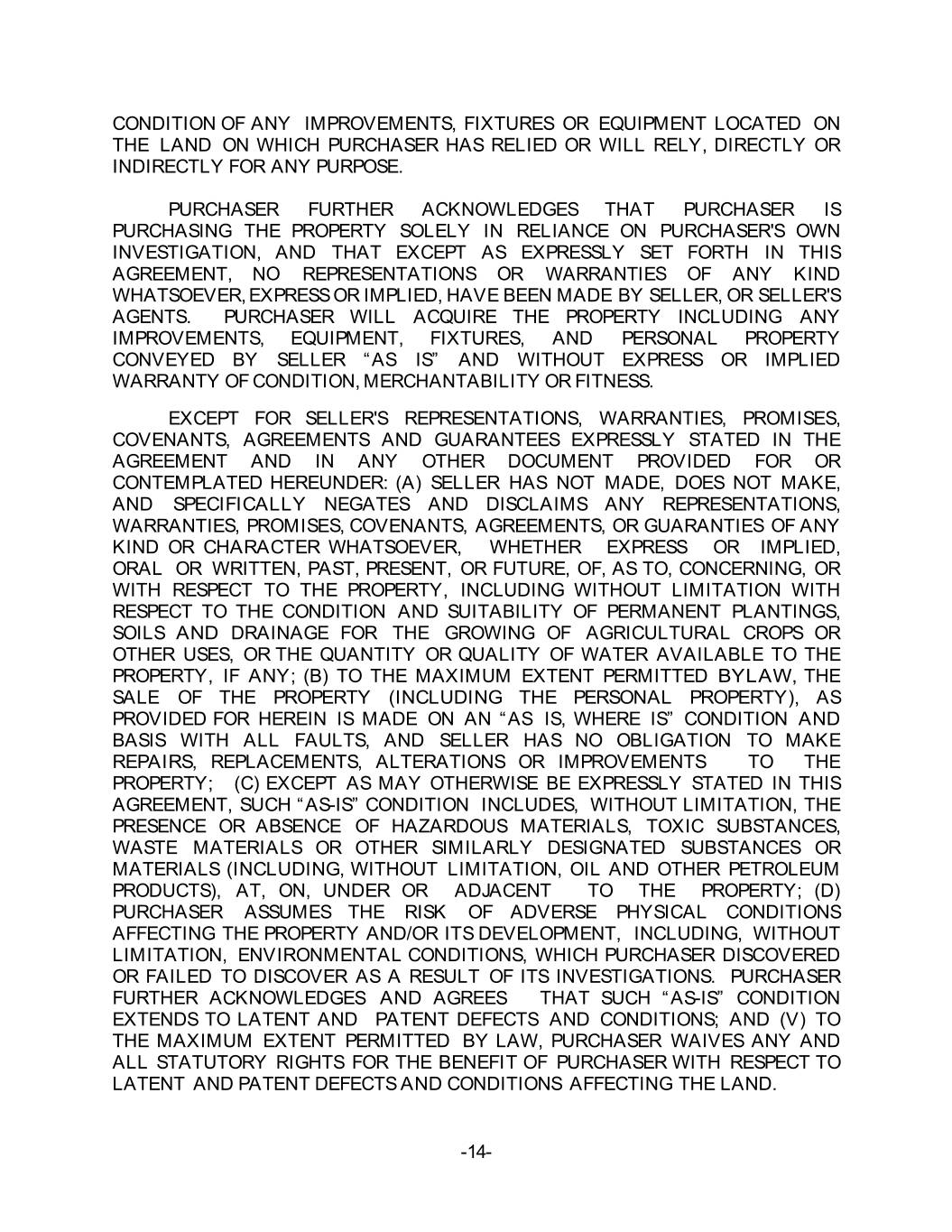 CONDITION OF ANY IMPROVEMENTS, FIXTURES OR EQUIPMENT LOCATED ON THE LAND ON WHICH PURCHASER HAS RELIED OR WILL RELY, DIRECTLY OR INDIRECTLY FOR ANY PURPOSE. PURCHASER FURTHER ACKNOWLEDGES THAT PURCHASER IS PURCHASING THE PROPERTY SOLELY IN RELIANCE ON PURCHASER'S OWN INVESTIGATION, AND THAT EXCEPT AS EXPRESSLY SET FORTH IN THIS AGREEMENT, NO REPRESENTATIONS OR WARRANTIES OF ANY KIND WHATSOEVER, EXPRESS OR IMPLIED, HAVE BEEN MADE BY SELLER, OR SELLER'S AGENTS. PURCHASER WILL ACQUIRE THE PROPERTY INCLUDING ANY IMPROVEMENTS, EQUIPMENT, FIXTURES, AND PERSONAL PROPERTY CONVEYED BY SELLER “AS IS” AND WITHOUT EXPRESS OR IMPLIED WARRANTY OF CONDITION, MERCHANTABILITY OR FITNESS. EXCEPT FOR SELLER'S REPRESENTATIONS, WARRANTIES, PROMISES, COVENANTS, AGREEMENTS AND GUARANTEES EXPRESSLY STATED IN THE AGREEMENT AND IN ANY OTHER DOCUMENT PROVIDED FOR OR CONTEMPLATED HEREUNDER: (A) SELLER HAS NOT MADE, DOES NOT MAKE, AND SPECIFICALLY NEGATES AND DISCLAIMS ANY REPRESENTATIONS, WARRANTIES, PROMISES, COVENANTS, AGREEMENTS, OR GUARANTIES OF ANY KIND OR CHARACTER WHATSOEVER, WHETHER EXPRESS OR IMPLIED, ORAL OR WRITTEN, PAST, PRESENT, OR FUTURE, OF, AS TO, CONCERNING, OR WITH RESPECT TO THE PROPERTY, INCLUDING WITHOUT LIMITATION WITH RESPECT TO THE CONDITION AND SUITABILITY OF PERMANENT PLANTINGS, SOILS AND DRAINAGE FOR THE GROWING OF AGRICULTURAL CROPS OR OTHER USES, OR THE QUANTITY OR QUALITY OF WATER AVAILABLE TO THE PROPERTY, IF ANY; (B) TO THE MAXIMUM EXTENT PERMITTED BYLAW, THE SALE OF THE PROPERTY (INCLUDING THE PERSONAL PROPERTY), AS PROVIDED FOR HEREIN IS MADE ON AN “AS IS, WHERE IS” CONDITION AND BASIS WITH ALL FAULTS, AND SELLER HAS NO OBLIGATION TO MAKE REPAIRS, REPLACEMENTS, ALTERATIONS OR IMPROVEMENTS TO THE PROPERTY; (C) EXCEPT AS MAY OTHERWISE BE EXPRESSLY STATED IN THIS AGREEMENT, SUCH “AS-IS” CONDITION INCLUDES, WITHOUT LIMITATION, THE PRESENCE OR ABSENCE OF HAZARDOUS MATERIALS, TOXIC SUBSTANCES, WASTE MATERIALS OR OTHER SIMILARLY DESIGNATED SUBSTANCES OR MATERIALS (INCLUDING, WITHOUT LIMITATION, OIL AND OTHER PETROLEUM PRODUCTS), AT, ON, UNDER OR ADJACENT TO THE PROPERTY; (D) PURCHASER ASSUMES THE RISK OF ADVERSE PHYSICAL CONDITIONS AFFECTING THE PROPERTY AND/OR ITS DEVELOPMENT, INCLUDING, WITHOUT LIMITATION, ENVIRONMENTAL CONDITIONS, WHICH PURCHASER DISCOVERED OR FAILED TO DISCOVER AS A RESULT OF ITS INVESTIGATIONS. PURCHASER FURTHER ACKNOWLEDGES AND AGREES THAT SUCH “AS-IS” CONDITION EXTENDS TO LATENT AND PATENT DEFECTS AND CONDITIONS; AND (V) TO THE MAXIMUM EXTENT PERMITTED BY LAW, PURCHASER WAIVES ANY AND ALL STATUTORY RIGHTS FOR THE BENEFIT OF PURCHASER WITH RESPECT TO LATENT AND PATENT DEFECTS AND CONDITIONS AFFECTING THE LAND. -14-