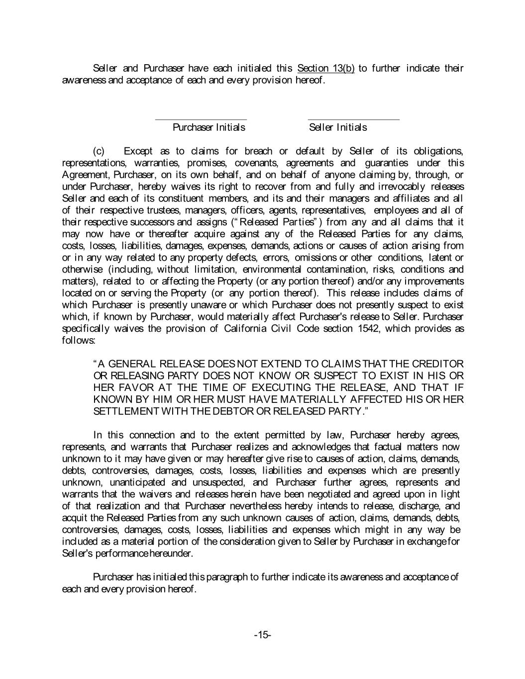 Seller and Purchaser have each initialed this Section 13(b) to further indicate their awareness and acceptance of each and every provision hereof. Purchaser Initials Seller Initials (c) Except as to claims for breach or default by Seller of its obligations, representations, warranties, promises, covenants, agreements and guaranties under this Agreement, Purchaser, on its own behalf, and on behalf of anyone claiming by, through, or under Purchaser, hereby waives its right to recover from and fully and irrevocably releases Seller and each of its constituent members, and its and their managers and affiliates and all of their respective trustees, managers, officers, agents, representatives, employees and all of their respective successors and assigns (“Released Parties”) from any and all claims that it may now have or thereafter acquire against any of the Released Parties for any claims, costs, losses, liabilities, damages, expenses, demands, actions or causes of action arising from or in any way related to any property defects, errors, omissions or other conditions, latent or otherwise (including, without limitation, environmental contamination, risks, conditions and matters), related to or affecting the Property (or any portion thereof) and/or any improvements located on or serving the Property (or any portion thereof). This release includes claims of which Purchaser is presently unaware or which Purchaser does not presently suspect to exist which, if known by Purchaser, would materially affect Purchaser's release to Seller. Purchaser specifically waives the provision of California Civil Code section 1542, which provides as follows: “A GENERAL RELEASE DOES NOT EXTEND TO CLAIMS THAT THE CREDITOR OR RELEASING PARTY DOES NOT KNOW OR SUSPECT TO EXIST IN HIS OR HER FAVOR AT THE TIME OF EXECUTING THE RELEASE, AND THAT IF KNOWN BY HIM OR HER MUST HAVE MATERIALLY AFFECTED HIS OR HER SETTLEMENT WITH THE DEBTOR OR RELEASED PARTY.” In this connection and to the extent permitted by law, Purchaser hereby agrees, represents, and warrants that Purchaser realizes and acknowledges that factual matters now unknown to it may have given or may hereafter give rise to causes of action, claims, demands, debts, controversies, damages, costs, losses, liabilities and expenses which are presently unknown, unanticipated and unsuspected, and Purchaser further agrees, represents and warrants that the waivers and releases herein have been negotiated and agreed upon in light of that realization and that Purchaser nevertheless hereby intends to release, discharge, and acquit the Released Parties from any such unknown causes of action, claims, demands, debts, controversies, damages, costs, losses, liabilities and expenses which might in any way be included as a material portion of the consideration given to Seller by Purchaser in exchange for Seller's performance hereunder. Purchaser has initialed this paragraph to further indicate its awareness and acceptance of each and every provision hereof. -15-