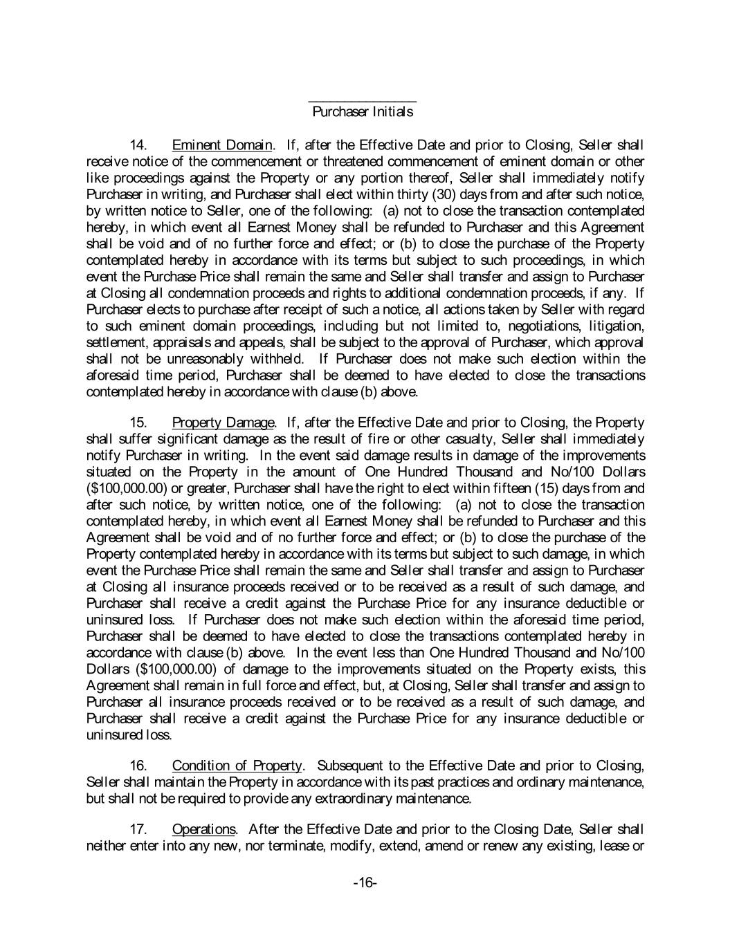 _______________ Purchaser Initials 14. Eminent Domain. If, after the Effective Date and prior to Closing, Seller shall receive notice of the commencement or threatened commencement of eminent domain or other like proceedings against the Property or any portion thereof, Seller shall immediately notify Purchaser in writing, and Purchaser shall elect within thirty (30) days from and after such notice, by written notice to Seller, one of the following: (a) not to close the transaction contemplated hereby, in which event all Earnest Money shall be refunded to Purchaser and this Agreement shall be void and of no further force and effect; or (b) to close the purchase of the Property contemplated hereby in accordance with its terms but subject to such proceedings, in which event the Purchase Price shall remain the same and Seller shall transfer and assign to Purchaser at Closing all condemnation proceeds and rights to additional condemnation proceeds, if any. If Purchaser elects to purchase after receipt of such a notice, all actions taken by Seller with regard to such eminent domain proceedings, including but not limited to, negotiations, litigation, settlement, appraisals and appeals, shall be subject to the approval of Purchaser, which approval shall not be unreasonably withheld. If Purchaser does not make such election within the aforesaid time period, Purchaser shall be deemed to have elected to close the transactions contemplated hereby in accordance with clause (b) above. 15. Property Damage. If, after the Effective Date and prior to Closing, the Property shall suffer significant damage as the result of fire or other casualty, Seller shall immediately notify Purchaser in writing. In the event said damage results in damage of the improvements situated on the Property in the amount of One Hundred Thousand and No/100 Dollars ($100,000.00) or greater, Purchaser shall have the right to elect within fifteen (15) days from and after such notice, by written notice, one of the following: (a) not to close the transaction contemplated hereby, in which event all Earnest Money shall be refunded to Purchaser and this Agreement shall be void and of no further force and effect; or (b) to close the purchase of the Property contemplated hereby in accordance with its terms but subject to such damage, in which event the Purchase Price shall remain the same and Seller shall transfer and assign to Purchaser at Closing all insurance proceeds received or to be received as a result of such damage, and Purchaser shall receive a credit against the Purchase Price for any insurance deductible or uninsured loss. If Purchaser does not make such election within the aforesaid time period, Purchaser shall be deemed to have elected to close the transactions contemplated hereby in accordance with clause (b) above. In the event less than One Hundred Thousand and No/100 Dollars ($100,000.00) of damage to the improvements situated on the Property exists, this Agreement shall remain in full force and effect, but, at Closing, Seller shall transfer and assign to Purchaser all insurance proceeds received or to be received as a result of such damage, and Purchaser shall receive a credit against the Purchase Price for any insurance deductible or uninsured loss. 16. Condition of Property. Subsequent to the Effective Date and prior to Closing, Seller shall maintain the Property in accordance with its past practices and ordinary maintenance, but shall not be required to provide any extraordinary maintenance. 17. Operations. After the Effective Date and prior to the Closing Date, Seller shall neither enter into any new, nor terminate, modify, extend, amend or renew any existing, lease or -16-