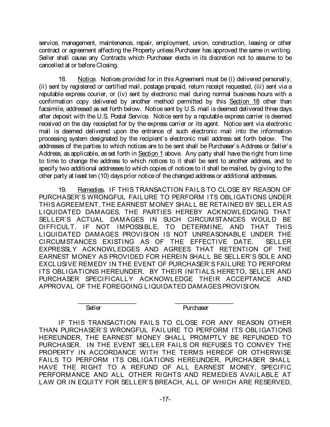 service, management, maintenance, repair, employment, union, construction, leasing or other contract or agreement affecting the Property unless Purchaser has approved the same in writing. Seller shall cause any Contracts which Purchaser elects in its discretion not to assume to be cancelled at or before Closing. 18. Notice. Notices provided for in this Agreement must be (i) delivered personally, (ii) sent by registered or certified mail, postage prepaid, return receipt requested, (iii) sent via a reputable express courier, or (iv) sent by electronic mail during normal business hours with a confirmation copy delivered by another method permitted by this Section 18 other than facsimile, addressed as set forth below. Notice sent by U.S. mail is deemed delivered three days after deposit with the U.S. Postal Service. Notice sent by a reputable express carrier is deemed received on the day receipted for by the express carrier or its agent. Notice sent via electronic mail is deemed delivered upon the entrance of such electronic mail into the information processing system designated by the recipient’s electronic mail address set forth below. The addresses of the parties to which notices are to be sent shall be Purchaser’s Address or Seller’s Address, as applicable, as set forth in Section 1 above. Any party shall have the right from time to time to change the address to which notices to it shall be sent to another address, and to specify two additional addresses to which copies of notices to it shall be mailed, by giving to the other party at least ten (10) days prior notice of the changed address or additional addresses. 19. Remedies. IF THIS TRANSACTION FAILS TO CLOSE BY REASON OF PURCHASER’S WRONGFUL FAILURE TO PERFORM ITS OBLIGATIONS UNDER THIS AGREEMENT, THE EARNEST MONEY SHALL BE RETAINED BY SELLER AS LIQUIDATED DAMAGES, THE PARTIES HEREBY ACKNOWLEDGING THAT SELLER’S ACTUAL DAMAGES IN SUCH CIRCUMSTANCES WOULD BE DIFFICULT, IF NOT IMPOSSIBLE, TO DETERMINE, AND THAT THIS LIQUIDATED DAMAGES PROVISION IS NOT UNREASONABLE UNDER THE CIRCUMSTANCES EXISTING AS OF THE EFFECTIVE DATE. SELLER EXPRESSLY ACKNOWLEDGES AND AGREES THAT RETENTION OF THE EARNEST MONEY AS PROVIDED FOR HEREIN SHALL BE SELLER’S SOLE AND EXCLUSIVE REMEDY IN THE EVENT OF PURCHASER’S FAILURE TO PERFORM ITS OBLIGATIONS HEREUNDER. BY THEIR INITIALS HERETO, SELLER AND PURCHASER SPECIFICALLY ACKNOWLEDGE THEIR ACCEPTANCE AND APPROVAL OF THE FOREGOING LIQUIDATED DAMAGES PROVISION. __________________ __________________ Seller Purchaser IF THIS TRANSACTION FAILS TO CLOSE FOR ANY REASON OTHER THAN PURCHASER’S WRONGFUL FAILURE TO PERFORM ITS OBLIGATIONS HEREUNDER, THE EARNEST MONEY SHALL PROMPTLY BE REFUNDED TO PURCHASER. IN THE EVENT SELLER FAILS OR REFUSES TO CONVEY THE PROPERTY IN ACCORDANCE WITH THE TERMS HEREOF OR OTHERWISE FAILS TO PERFORM ITS OBLIGATIONS HEREUNDER, PURCHASER SHALL HAVE THE RIGHT TO A REFUND OF ALL EARNEST MONEY, SPECIFIC PERFORMANCE AND ALL OTHER RIGHTS AND REMEDIES AVAILABLE AT LAW OR IN EQUITY FOR SELLER’S BREACH, ALL OF WHICH ARE RESERVED, -17-