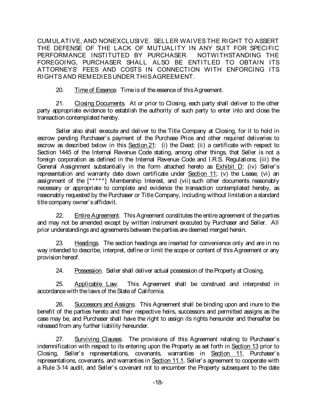 CUMULATIVE, AND NONEXCLUSIVE. SELLER WAIVES THE RIGHT TO ASSERT THE DEFENSE OF THE LACK OF MUTUALITY IN ANY SUIT FOR SPECIFIC PERFORMANCE INSTITUTED BY PURCHASER. NOTWITHSTANDING THE FOREGOING, PURCHASER SHALL ALSO BE ENTITLED TO OBTAIN ITS ATTORNEYS’ FEES AND COSTS IN CONNECTION WITH ENFORCING ITS RIGHTS AND REMEDIES UNDER THIS AGREEMENT. 20. Time of Essence. Time is of the essence of this Agreement. 21. Closing Documents. At or prior to Closing, each party shall deliver to the other party appropriate evidence to establish the authority of such party to enter into and close the transaction contemplated hereby. Seller also shall execute and deliver to the Title Company at Closing, for it to hold in escrow pending Purchaser’s payment of the Purchase Price and other required deliveries to escrow as described below in this Section 21: (i) the Deed; (ii) a certificate with respect to Section 1445 of the Internal Revenue Code stating, among other things, that Seller is not a foreign corporation as defined in the Internal Revenue Code and I.R.S. Regulations; (iii) the General Assignment substantially in the form attached hereto as Exhibit D; (iv) Seller’s representation and warranty date down certificate under Section 11; (v) the Lease; (vi) an assignment of the [*****] Membership Interest, and (vii) such other documents reasonably necessary or appropriate to complete and evidence the transaction contemplated hereby, as reasonably requested by the Purchaser or Title Company, including without limitation a standard title company owner’s affidavit. 22. Entire Agreement. This Agreement constitutes the entire agreement of the parties and may not be amended except by written instrument executed by Purchaser and Seller. All prior understandings and agreements between the parties are deemed merged herein. 23. Headings. The section headings are inserted for convenience only and are in no way intended to describe, interpret, define or limit the scope or content of this Agreement or any provision hereof. 24. Possession. Seller shall deliver actual possession of the Property at Closing. 25. Applicable Law. This Agreement shall be construed and interpreted in accordance with the laws of the State of California. 26. Successors and Assigns. This Agreement shall be binding upon and inure to the benefit of the parties hereto and their respective heirs, successors and permitted assigns as the case may be, and Purchaser shall have the right to assign its rights hereunder and thereafter be released from any further liability hereunder. 27. Surviving Clauses. The provisions of this Agreement relating to Purchaser’s indemnification with respect to its entering upon the Property as set forth in Section 13 prior to Closing, Seller’s representations, covenants, warranties in Section 11, Purchaser’s representations, covenants, and warranties in Section 11.1, Seller’s agreement to cooperate with a Rule 3-14 audit, and Seller’s covenant not to encumber the Property subsequent to the date -18-