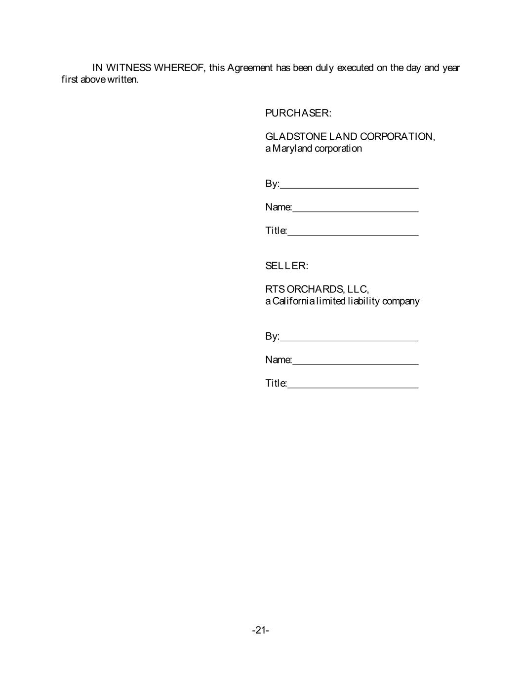 IN WITNESS WHEREOF, this Agreement has been duly executed on the day and year first above written. PURCHASER: GLADSTONE LAND CORPORATION, a Maryland corporation By: Name: Title: SELLER: RTS ORCHARDS, LLC, a California limited liability company By: Name: Title: -21-