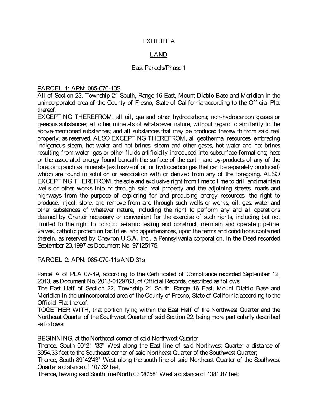 EXHIBIT A LAND East Parcels/Phase 1 PARCEL 1: APN: 085-070-10S All of Section 23, Township 21 South, Range 16 East, Mount Diablo Base and Meridian in the unincorporated area of the County of Fresno, State of California according to the Official Plat thereof. EXCEPTING THEREFROM, all oil, gas and other hydrocarbons; non-hydrocarbon gasses or gaseous substances; all other minerals of whatsoever nature, without regard to similarity to the above-mentioned substances; and all substances that may be produced therewith from said real property, as reserved, ALSO EXCEPTING THEREFROM, all geothermal resources, embracing indigenous steam, hot water and hot brines; steam and other gases, hot water and hot brines resulting from water, gas or other fluids artificially introduced into subsurface formations; heat or the associated energy found beneath the surface of the earth; and by-products of any of the foregoing such as minerals (exclusive of oil or hydrocarbon gas that can be separately produced) which are found in solution or association with or derived from any of the foregoing. ALSO EXCEPTING THEREFROM, the sole and exclusive right from time to time to drill and maintain wells or other works into or through said real property and the adjoining streets, roads and highways from the purpose of exploring for and producing energy resources; the right to produce, inject, store, and remove from and through such wells or works, oil, gas, water and other substances of whatever nature, including the right to perform any and all operations deemed by Grantor necessary or convenient for the exercise of such rights, including but not limited to the right to conduct seismic testing and construct, maintain and operate pipeline, valves, catholic protection facilities, and appurtenances, upon the terms and conditions contained therein, as reserved by Chevron U.S.A. Inc., a Pennsylvania corporation, in the Deed recorded September 23,1997 as Document No. 97125175. PARCEL 2: APN: 085-070-11s AND 31s Parcel A of PLA 07-49, according to the Certificated of Compliance recorded September 12, 2013, as Document No. 2013-0129763, of Official Records, described as follows: The East Half of Section 22, Township 21 South, Range 16 East, Mount Diablo Base and Meridian in the unincorporated area of the County of Fresno, State of California according to the Official Plat thereof. TOGETHER WITH, that portion lying within the East Half of the Northwest Quarter and the Northeast Quarter of the Southwest Quarter of said Section 22, being more particularly described as follows: BEGINNING, at the Northeast corner of said Northwest Quarter; Thence, South 00°21 '33" West along the East line of said Northwest Quarter a distance of 3954.33 feet to the Southeast corner of said Northeast Quarter of the Southwest Quarter; Thence, South 89°42'43" West along the south line of said Northeast Quarter of the Southwest Quarter a distance of 107.32 feet; Thence, leaving said South line North 03°20'58" West a distance of 1381.87 feet;
