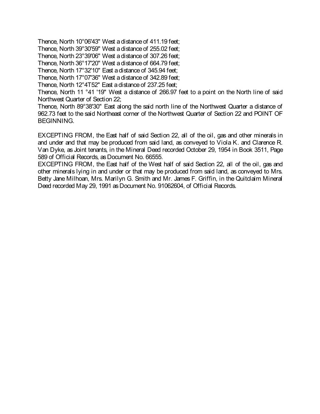 Thence, North 10°06'43" West a distance of 411.19 feet; Thence, North 39°30'59" West a distance of 255.02 feet; Thence, North 23°39'06" West a distance of 307.26 feet; Thence, North 36°17'20" West a distance of 664.79 feet; Thence, North 17°32'10" East a distance of 345.94 feet; Thence, North 17°07'36" West a distance of 342.89 feet; Thence, North 12°4T52" East a distance of 237.25 feet; Thence, North 11 °41 '19" West a distance of 266.97 feet to a point on the North line of said Northwest Quarter of Section 22; Thence, North 89°38'30" East along the said north line of the Northwest Quarter a distance of 962.73 feet to the said Northeast corner of the Northwest Quarter of Section 22 and POINT OF BEGINNING. EXCEPTING FROM, the East half of said Section 22, all of the oil, gas and other minerals in and under and that may be produced from said land, as conveyed to Viola K. and Clarence R. Van Dyke, as Joint tenants, in the Mineral Deed recorded October 29, 1954 in Book 3511, Page 589 of Official Records, as Document No. 66555. EXCEPTING FROM, the East half of the West half of said Section 22, all of the oil, gas and other minerals lying in and under or that may be produced from said land, as conveyed to Mrs. Betty Jane Milhoan, Mrs. Marilyn G. Smith and Mr. James F. Griffin, in the Quitclaim Mineral Deed recorded May 29, 1991 as Document No. 91062604, of Official Records.