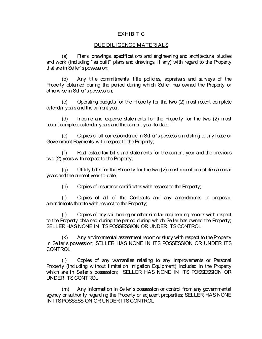 EXHIBIT C DUE DILIGENCE MATERIALS (a) Plans, drawings, specifications and engineering and architectural studies and work (including “as built” plans and drawings, if any) with regard to the Property that are in Seller’s possession; (b) Any title commitments, title policies, appraisals and surveys of the Property obtained during the period during which Seller has owned the Property or otherwise in Seller’s possession; (c) Operating budgets for the Property for the two (2) most recent complete calendar years and the current year; (d) Income and expense statements for the Property for the two (2) most recent complete calendar years and the current year-to-date; (e) Copies of all correspondence in Seller’s possession relating to any lease or Government Payments with respect to the Property; (f) Real estate tax bills and statements for the current year and the previous two (2) years with respect to the Property; (g) Utility bills for the Property for the two (2) most recent complete calendar years and the current year-to-date; (h) Copies of insurance certificates with respect to the Property; (i) Copies of all of the Contracts and any amendments or proposed amendments thereto with respect to the Property; (j) Copies of any soil boring or other similar engineering reports with respect to the Property obtained during the period during which Seller has owned the Property; SELLER HAS NONE IN ITS POSSESSION OR UNDER ITS CONTROL (k) Any environmental assessment report or study with respect to the Property in Seller’s possession; SELLER HAS NONE IN ITS POSSESSION OR UNDER ITS CONTROL (l) Copies of any warranties relating to any Improvements or Personal Property (including without limitation Irrigation Equipment) included in the Property which are in Seller’s possession; SELLER HAS NONE IN ITS POSSESSION OR UNDER ITS CONTROL (m) Any information in Seller’s possession or control from any governmental agency or authority regarding the Property or adjacent properties; SELLER HAS NONE IN ITS POSSESSION OR UNDER ITS CONTROL