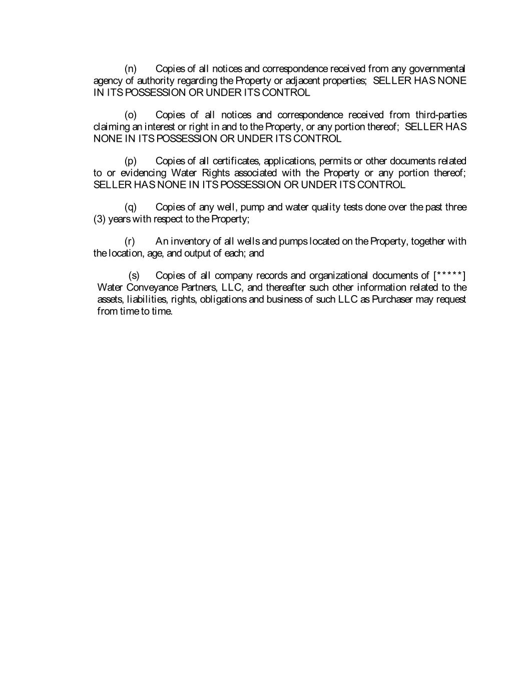(n) Copies of all notices and correspondence received from any governmental agency of authority regarding the Property or adjacent properties; SELLER HAS NONE IN ITS POSSESSION OR UNDER ITS CONTROL (o) Copies of all notices and correspondence received from third-parties claiming an interest or right in and to the Property, or any portion thereof; SELLER HAS NONE IN ITS POSSESSION OR UNDER ITS CONTROL (p) Copies of all certificates, applications, permits or other documents related to or evidencing Water Rights associated with the Property or any portion thereof; SELLER HAS NONE IN ITS POSSESSION OR UNDER ITS CONTROL (q) Copies of any well, pump and water quality tests done over the past three (3) years with respect to the Property; (r) An inventory of all wells and pumps located on the Property, together with the location, age, and output of each; and (s) Copies of all company records and organizational documents of [*****] Water Conveyance Partners, LLC, and thereafter such other information related to the assets, liabilities, rights, obligations and business of such LLC as Purchaser may request from time to time.