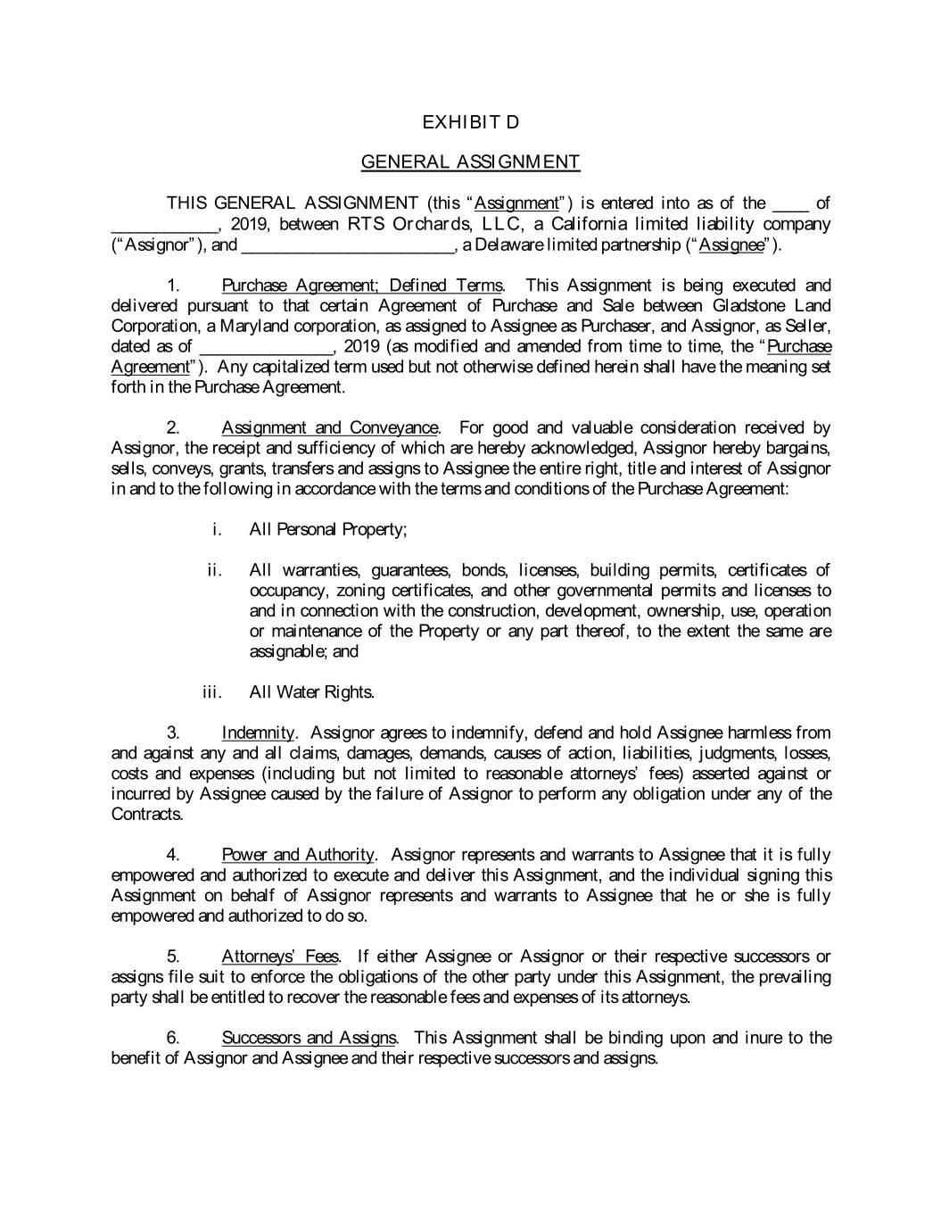 EXHIBIT D GENERAL ASSIGNMENT THIS GENERAL ASSIGNMENT (this “Assignment”) is entered into as of the ____ of ____________, 2019, between RTS Orchards, LLC, a California limited liability company (“Assignor”), and ________________________, a Delaware limited partnership (“Assignee”). 1. Purchase Agreement; Defined Terms. This Assignment is being executed and delivered pursuant to that certain Agreement of Purchase and Sale between Gladstone Land Corporation, a Maryland corporation, as assigned to Assignee as Purchaser, and Assignor, as Seller, dated as of _______________, 2019 (as modified and amended from time to time, the “Purchase Agreement”). Any capitalized term used but not otherwise defined herein shall have the meaning set forth in the Purchase Agreement. 2. Assignment and Conveyance. For good and valuable consideration received by Assignor, the receipt and sufficiency of which are hereby acknowledged, Assignor hereby bargains, sells, conveys, grants, transfers and assigns to Assignee the entire right, title and interest of Assignor in and to the following in accordance with the terms and conditions of the Purchase Agreement: i. All Personal Property; ii. All warranties, guarantees, bonds, licenses, building permits, certificates of occupancy, zoning certificates, and other governmental permits and licenses to and in connection with the construction, development, ownership, use, operation or maintenance of the Property or any part thereof, to the extent the same are assignable; and iii. All Water Rights. 3. Indemnity. Assignor agrees to indemnify, defend and hold Assignee harmless from and against any and all claims, damages, demands, causes of action, liabilities, judgments, losses, costs and expenses (including but not limited to reasonable attorneys’ fees) asserted against or incurred by Assignee caused by the failure of Assignor to perform any obligation under any of the Contracts. 4. Power and Authority. Assignor represents and warrants to Assignee that it is fully empowered and authorized to execute and deliver this Assignment, and the individual signing this Assignment on behalf of Assignor represents and warrants to Assignee that he or she is fully empowered and authorized to do so. 5. Attorneys’ Fees. If either Assignee or Assignor or their respective successors or assigns file suit to enforce the obligations of the other party under this Assignment, the prevailing party shall be entitled to recover the reasonable fees and expenses of its attorneys. 6. Successors and Assigns. This Assignment shall be binding upon and inure to the benefit of Assignor and Assignee and their respective successors and assigns.