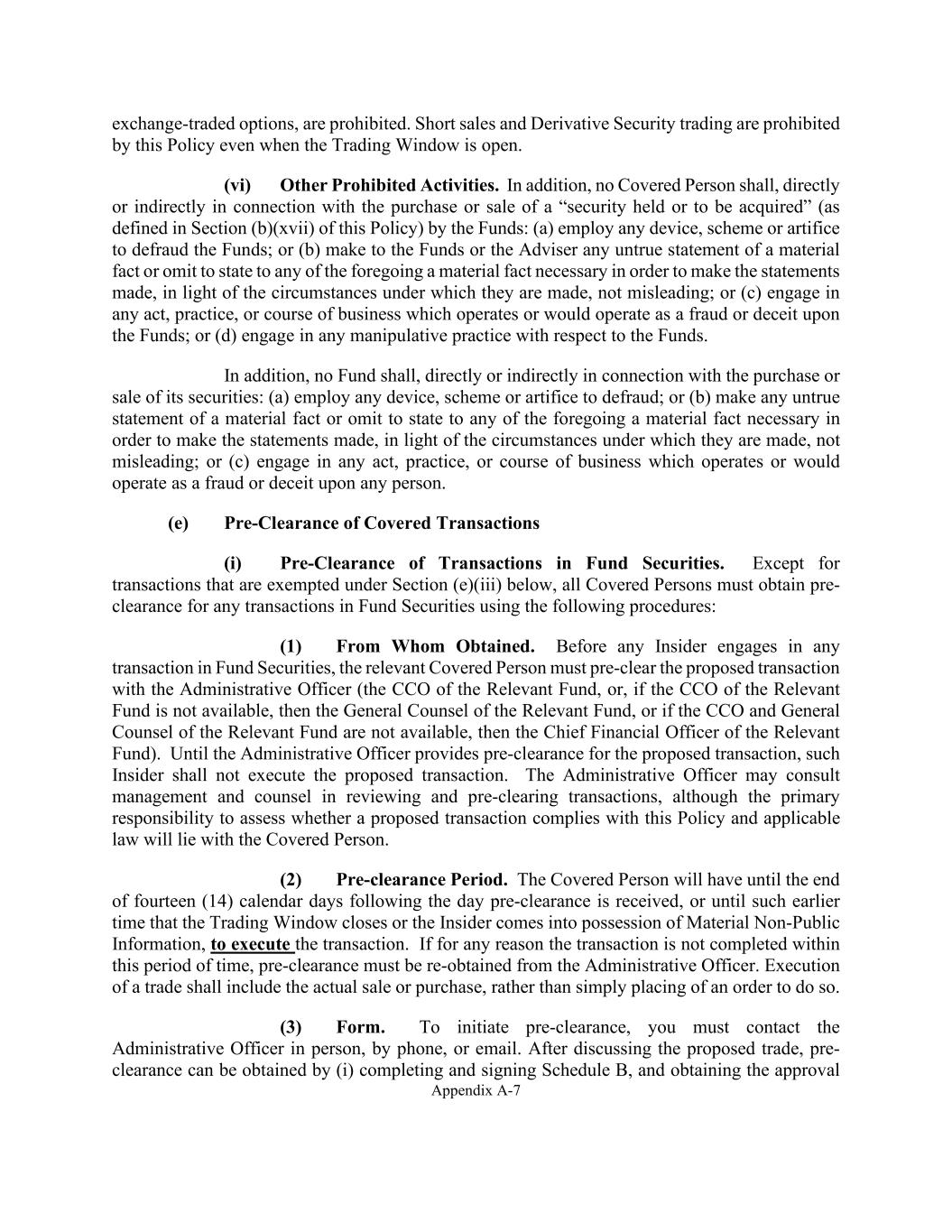 Appendix A-7 exchange-traded options, are prohibited. Short sales and Derivative Security trading are prohibited by this Policy even when the Trading Window is open. (vi) Other Prohibited Activities. In addition, no Covered Person shall, directly or indirectly in connection with the purchase or sale of a “security held or to be acquired” (as defined in Section (b)(xvii) of this Policy) by the Funds: (a) employ any device, scheme or artifice to defraud the Funds; or (b) make to the Funds or the Adviser any untrue statement of a material fact or omit to state to any of the foregoing a material fact necessary in order to make the statements made, in light of the circumstances under which they are made, not misleading; or (c) engage in any act, practice, or course of business which operates or would operate as a fraud or deceit upon the Funds; or (d) engage in any manipulative practice with respect to the Funds. In addition, no Fund shall, directly or indirectly in connection with the purchase or sale of its securities: (a) employ any device, scheme or artifice to defraud; or (b) make any untrue statement of a material fact or omit to state to any of the foregoing a material fact necessary in order to make the statements made, in light of the circumstances under which they are made, not misleading; or (c) engage in any act, practice, or course of business which operates or would operate as a fraud or deceit upon any person. (e) Pre-Clearance of Covered Transactions (i) Pre-Clearance of Transactions in Fund Securities. Except for transactions that are exempted under Section (e)(iii) below, all Covered Persons must obtain pre- clearance for any transactions in Fund Securities using the following procedures: (1) From Whom Obtained. Before any Insider engages in any transaction in Fund Securities, the relevant Covered Person must pre-clear the proposed transaction with the Administrative Officer (the CCO of the Relevant Fund, or, if the CCO of the Relevant Fund is not available, then the General Counsel of the Relevant Fund, or if the CCO and General Counsel of the Relevant Fund are not available, then the Chief Financial Officer of the Relevant Fund). Until the Administrative Officer provides pre-clearance for the proposed transaction, such Insider shall not execute the proposed transaction. The Administrative Officer may consult management and counsel in reviewing and pre-clearing transactions, although the primary responsibility to assess whether a proposed transaction complies with this Policy and applicable law will lie with the Covered Person. (2) Pre-clearance Period. The Covered Person will have until the end of fourteen (14) calendar days following the day pre-clearance is received, or until such earlier time that the Trading Window closes or the Insider comes into possession of Material Non-Public Information, to execute the transaction. If for any reason the transaction is not completed within this period of time, pre-clearance must be re-obtained from the Administrative Officer. Execution of a trade shall include the actual sale or purchase, rather than simply placing of an order to do so. (3) Form. To initiate pre-clearance, you must contact the Administrative Officer in person, by phone, or email. After discussing the proposed trade, pre- clearance can be obtained by (i) completing and signing Schedule B, and obtaining the approval