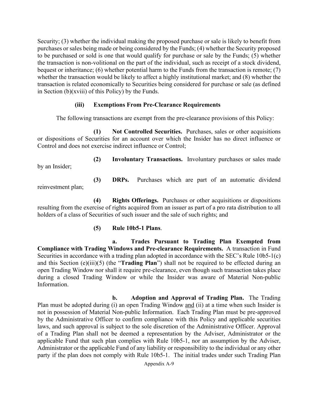 Appendix A-9 Security; (3) whether the individual making the proposed purchase or sale is likely to benefit from purchases or sales being made or being considered by the Funds; (4) whether the Security proposed to be purchased or sold is one that would qualify for purchase or sale by the Funds; (5) whether the transaction is non-volitional on the part of the individual, such as receipt of a stock dividend, bequest or inheritance; (6) whether potential harm to the Funds from the transaction is remote; (7) whether the transaction would be likely to affect a highly institutional market; and (8) whether the transaction is related economically to Securities being considered for purchase or sale (as defined in Section (b)(xviii) of this Policy) by the Funds. (iii) Exemptions From Pre-Clearance Requirements The following transactions are exempt from the pre-clearance provisions of this Policy: (1) Not Controlled Securities. Purchases, sales or other acquisitions or dispositions of Securities for an account over which the Insider has no direct influence or Control and does not exercise indirect influence or Control; (2) Involuntary Transactions. Involuntary purchases or sales made by an Insider; (3) DRPs. Purchases which are part of an automatic dividend reinvestment plan; (4) Rights Offerings. Purchases or other acquisitions or dispositions resulting from the exercise of rights acquired from an issuer as part of a pro rata distribution to all holders of a class of Securities of such issuer and the sale of such rights; and (5) Rule 10b5-1 Plans. a. Trades Pursuant to Trading Plan Exempted from Compliance with Trading Windows and Pre-clearance Requirements. A transaction in Fund Securities in accordance with a trading plan adopted in accordance with the SEC’s Rule 10b5-1(c) and this Section (e)(iii)(5) (the “Trading Plan”) shall not be required to be effected during an open Trading Window nor shall it require pre-clearance, even though such transaction takes place during a closed Trading Window or while the Insider was aware of Material Non-public Information. b. Adoption and Approval of Trading Plan. The Trading Plan must be adopted during (i) an open Trading Window and (ii) at a time when such Insider is not in possession of Material Non-public Information. Each Trading Plan must be pre-approved by the Administrative Officer to confirm compliance with this Policy and applicable securities laws, and such approval is subject to the sole discretion of the Administrative Officer. Approval of a Trading Plan shall not be deemed a representation by the Adviser, Administrator or the applicable Fund that such plan complies with Rule 10b5-1, nor an assumption by the Adviser, Administrator or the applicable Fund of any liability or responsibility to the individual or any other party if the plan does not comply with Rule 10b5-1. The initial trades under such Trading Plan