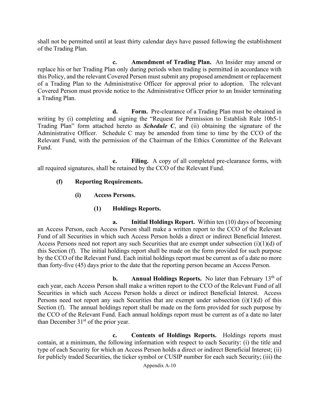 Appendix A-10 shall not be permitted until at least thirty calendar days have passed following the establishment of the Trading Plan. c. Amendment of Trading Plan. An Insider may amend or replace his or her Trading Plan only during periods when trading is permitted in accordance with this Policy, and the relevant Covered Person must submit any proposed amendment or replacement of a Trading Plan to the Administrative Officer for approval prior to adoption. The relevant Covered Person must provide notice to the Administrative Officer prior to an Insider terminating a Trading Plan. d. Form. Pre-clearance of a Trading Plan must be obtained in writing by (i) completing and signing the “Request for Permission to Establish Rule 10b5-1 Trading Plan” form attached hereto as Schedule C, and (ii) obtaining the signature of the Administrative Officer. Schedule C may be amended from time to time by the CCO of the Relevant Fund, with the permission of the Chairman of the Ethics Committee of the Relevant Fund. e. Filing. A copy of all completed pre-clearance forms, with all required signatures, shall be retained by the CCO of the Relevant Fund. (f) Reporting Requirements. (i) Access Persons. (1) Holdings Reports. a. Initial Holdings Report. Within ten (10) days of becoming an Access Person, each Access Person shall make a written report to the CCO of the Relevant Fund of all Securities in which such Access Person holds a direct or indirect Beneficial Interest. Access Persons need not report any such Securities that are exempt under subsection (i)(1)(d) of this Section (f). The initial holdings report shall be made on the form provided for such purpose by the CCO of the Relevant Fund. Each initial holdings report must be current as of a date no more than forty-five (45) days prior to the date that the reporting person became an Access Person. b. Annual Holdings Reports. No later than February 13th of each year, each Access Person shall make a written report to the CCO of the Relevant Fund of all Securities in which such Access Person holds a direct or indirect Beneficial Interest. Access Persons need not report any such Securities that are exempt under subsection (i)(1)(d) of this Section (f). The annual holdings report shall be made on the form provided for such purpose by the CCO of the Relevant Fund. Each annual holdings report must be current as of a date no later than December 31st of the prior year. c. Contents of Holdings Reports. Holdings reports must contain, at a minimum, the following information with respect to each Security: (i) the title and type of each Security for which an Access Person holds a direct or indirect Beneficial Interest; (ii) for publicly traded Securities, the ticker symbol or CUSIP number for each such Security; (iii) the