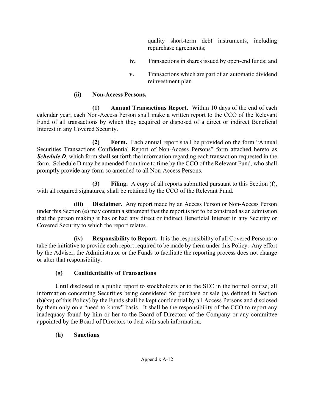 Appendix A-12 quality short-term debt instruments, including repurchase agreements; iv. Transactions in shares issued by open-end funds; and v. Transactions which are part of an automatic dividend reinvestment plan. (ii) Non-Access Persons. (1) Annual Transactions Report. Within 10 days of the end of each calendar year, each Non-Access Person shall make a written report to the CCO of the Relevant Fund of all transactions by which they acquired or disposed of a direct or indirect Beneficial Interest in any Covered Security. (2) Form. Each annual report shall be provided on the form “Annual Securities Transactions Confidential Report of Non-Access Persons” form attached hereto as Schedule D, which form shall set forth the information regarding each transaction requested in the form. Schedule D may be amended from time to time by the CCO of the Relevant Fund, who shall promptly provide any form so amended to all Non-Access Persons. (3) Filing. A copy of all reports submitted pursuant to this Section (f), with all required signatures, shall be retained by the CCO of the Relevant Fund. (iii) Disclaimer. Any report made by an Access Person or Non-Access Person under this Section (e) may contain a statement that the report is not to be construed as an admission that the person making it has or had any direct or indirect Beneficial Interest in any Security or Covered Security to which the report relates. (iv) Responsibility to Report. It is the responsibility of all Covered Persons to take the initiative to provide each report required to be made by them under this Policy. Any effort by the Adviser, the Administrator or the Funds to facilitate the reporting process does not change or alter that responsibility. (g) Confidentiality of Transactions Until disclosed in a public report to stockholders or to the SEC in the normal course, all information concerning Securities being considered for purchase or sale (as defined in Section (b)(xv) of this Policy) by the Funds shall be kept confidential by all Access Persons and disclosed by them only on a “need to know” basis. It shall be the responsibility of the CCO to report any inadequacy found by him or her to the Board of Directors of the Company or any committee appointed by the Board of Directors to deal with such information. (h) Sanctions