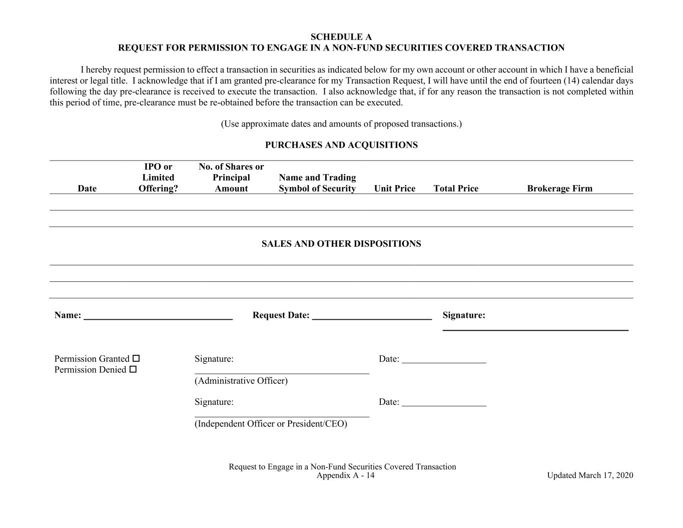 Request to Engage in a Non-Fund Securities Covered Transaction Appendix A - 14 Updated March 17, 2020 SCHEDULE A REQUEST FOR PERMISSION TO ENGAGE IN A NON-FUND SECURITIES COVERED TRANSACTION I hereby request permission to effect a transaction in securities as indicated below for my own account or other account in which I have a beneficial interest or legal title. I acknowledge that if I am granted pre-clearance for my Transaction Request, I will have until the end of fourteen (14) calendar days following the day pre-clearance is received to execute the transaction. I also acknowledge that, if for any reason the transaction is not completed within this period of time, pre-clearance must be re-obtained before the transaction can be executed. (Use approximate dates and amounts of proposed transactions.) PURCHASES AND ACQUISITIONS Date IPO or Limited Offering? No. of Shares or Principal Amount Name and Trading Symbol of Security Unit Price Total Price Brokerage Firm SALES AND OTHER DISPOSITIONS Name: Request Date: Signature: Permission Granted Permission Denied Signature: (Administrative Officer) Date: Signature: Date: (Independent Officer or President/CEO)