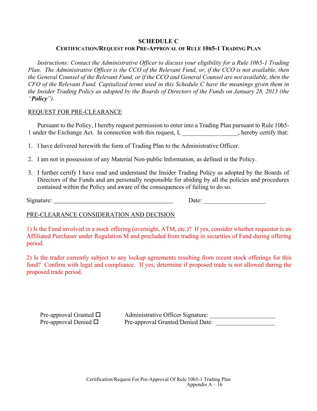 Certification/Request For Pre-Approval Of Rule 10b5-1 Trading Plan Appendix A – 16 SCHEDULE C CERTIFICATION/REQUEST FOR PRE-APPROVAL OF RULE 10B5-1 TRADING PLAN Instructions: Contact the Administrative Officer to discuss your eligibility for a Rule 10b5-1 Trading Plan. The Administrative Officer is the CCO of the Relevant Fund, or, if the CCO is not available, then the General Counsel of the Relevant Fund, or if the CCO and General Counsel are not available, then the CFO of the Relevant Fund. Capitalized terms used in this Schedule C have the meanings given them in the Insider Trading Policy as adopted by the Boards of Directors of the Funds on January 28, 2013 (the “Policy”). REQUEST FOR PRE-CLEARANCE Pursuant to the Policy, I hereby request permission to enter into a Trading Plan pursuant to Rule 10b5- 1 under the Exchange Act. In connection with this request, I, __________________, hereby certify that: 1. I have delivered herewith the form of Trading Plan to the Administrative Officer. 2. I am not in possession of any Material Non-public Information, as defined in the Policy. 3. I further certify I have read and understand the Insider Trading Policy as adopted by the Boards of Directors of the Funds and am personally responsible for abiding by all the policies and procedures contained within the Policy and aware of the consequences of failing to do so. Signature: Date: ____________________ PRE-CLEARANCE CONSIDERATION AND DECISION 1) Is the Fund involved in a stock offering (overnight, ATM, etc.)? If yes, consider whether requestor is an Affiliated Purchaser under Regulation M and precluded from trading in securities of Fund during offering period. 2) Is the trader currently subject to any lockup agreements resulting from recent stock offerings for this fund? Confirm with legal and compliance. If yes, determine if proposed trade is not allowed during the proposed trade period. Pre-approval Granted Pre-approval Denied Administrative Officer Signature: _____________________ Pre-approval Granted/Denied Date: ___________________